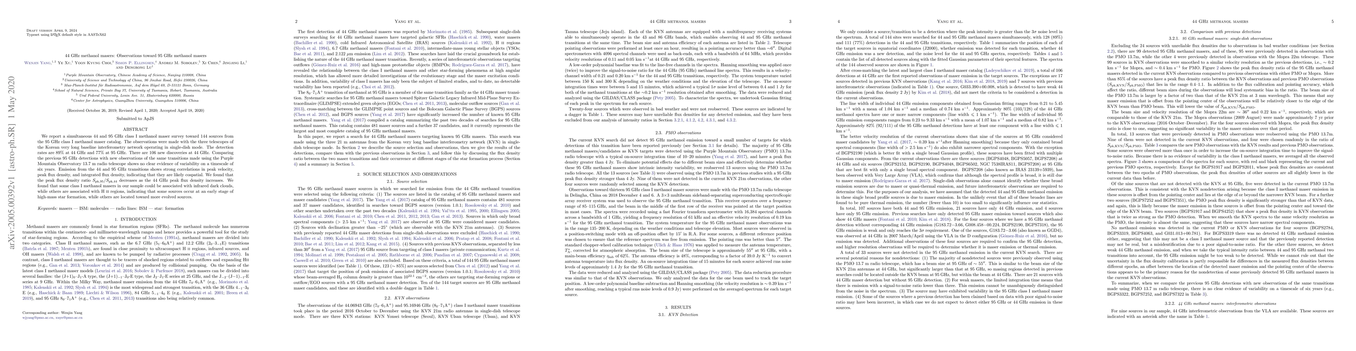 This study reports a survey of 144 sources using 44 and 95 GHz methanol masers, revealing strong correlations between the two transitions and detecting no variability over six years. The survey identified 106 new 44 GHz methanol masers, indicating different associations with infrared dark clouds and H II regions.