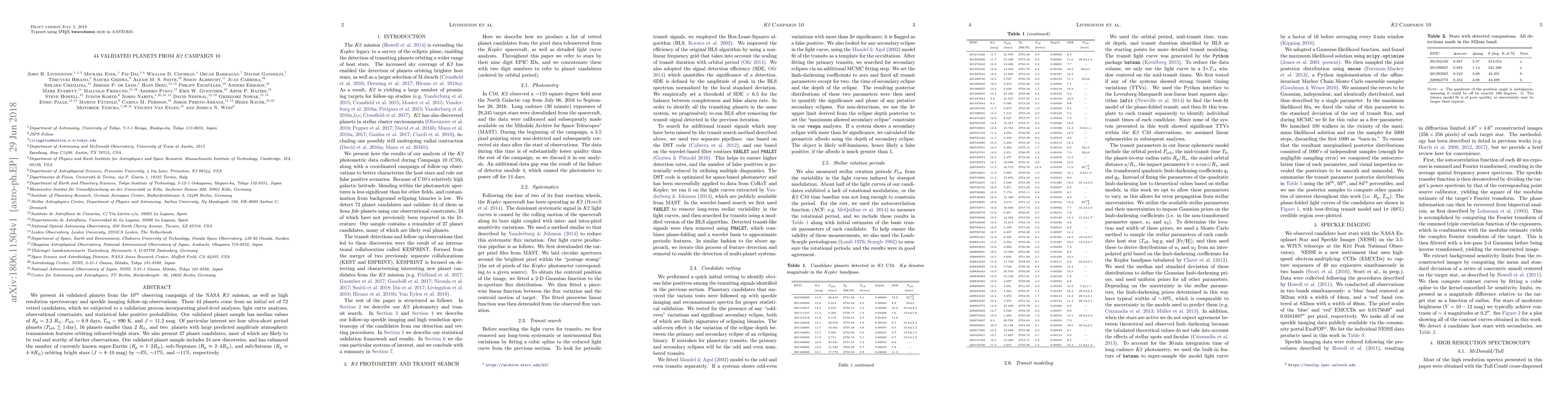 We present 44 validated planets from the 10$^\mathrm{th}$ observing campaign of the NASA $K2$ mission, as well as high resolution spectroscopy and speckle imaging follow-up observations. These 44 planets come from an initial set of 72 vetted candidates, which we subjected to a validation process incorporating pixel-level analyses, light curve analyses, observational constraints, and statistical false positive probabilities. Our validated planet sample has median values of $R_p$ = 2.2 $R_\oplus$, $P_\mathrm{orb}$ = 6.9 days, $T_{\mathrm{eq}}$ = 890 K, and $J$ = 11.2 mag. Of particular interest are four ultra-short period planets ($P_\mathrm{orb} \lesssim 1$ day), 16 planets smaller than 2 $R_\oplus$, and two planets with large predicted amplitude atmospheric transmission features orbiting infrared-bright stars. We also present 27 planet candidates, most of which are likely to be real and worthy of further observations. Our validated planet sample includes 24 new discoveries, and has enhanced the number of currently known super-Earths ($R_p \approx 1-2 R_\oplus$), sub-Neptunes ($R_p \approx 2-4 R_\oplus$), and sub-Saturns ($R_p \approx 4-8 R_\oplus$) orbiting bright stars ($J = 8-10$ mag) by $\sim$4%, $\sim$17%, and $\sim$11%, respectively.