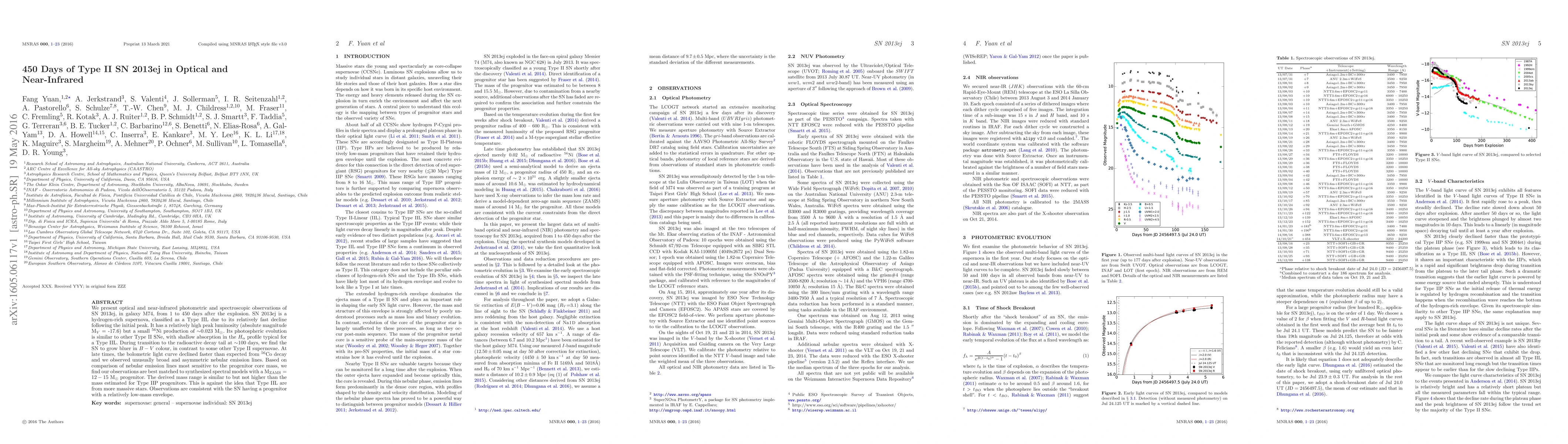 We present optical and near-infrared photometric and spectroscopic observations of SN 2013ej, in galaxy M74, from 1 to 450 days after the explosion. SN 2013ej is a hydrogen-rich supernova, classified as a Type IIL due to its relatively fast decline following the initial peak. It has a relatively high peak luminosity (absolute magnitude M$_\rm{V}$ = -17.6) but a small $^{56}$Ni production of ~0.023 M$_\odot$. Its photospheric evolution is similar to other Type II SNe, with shallow absorption in the H{\alpha} profile typical for a Type IIL. During transition to the radioactive decay tail at ~100 days, we find the SN to grow bluer in B - V colour, in contrast to some other Type II supernovae. At late times, the bolometric light curve declined faster than expected from $^{56}$Co decay and we observed unusually broad and asymmetric nebular emission lines. Based on comparison of nebular emission lines most sensitive to the progenitor core mass, we find our observations are best matched to synthesized spectral models with a M$_\rm{ZAMS}$ = 12 - 15 M$_\odot$ progenitor. The derived mass range is similar to but not higher than the mass estimated for Type IIP progenitors. This is against the idea that Type IIL are from more massive stars. Observations are consistent with the SN having a progenitor with a relatively low-mass envelope.