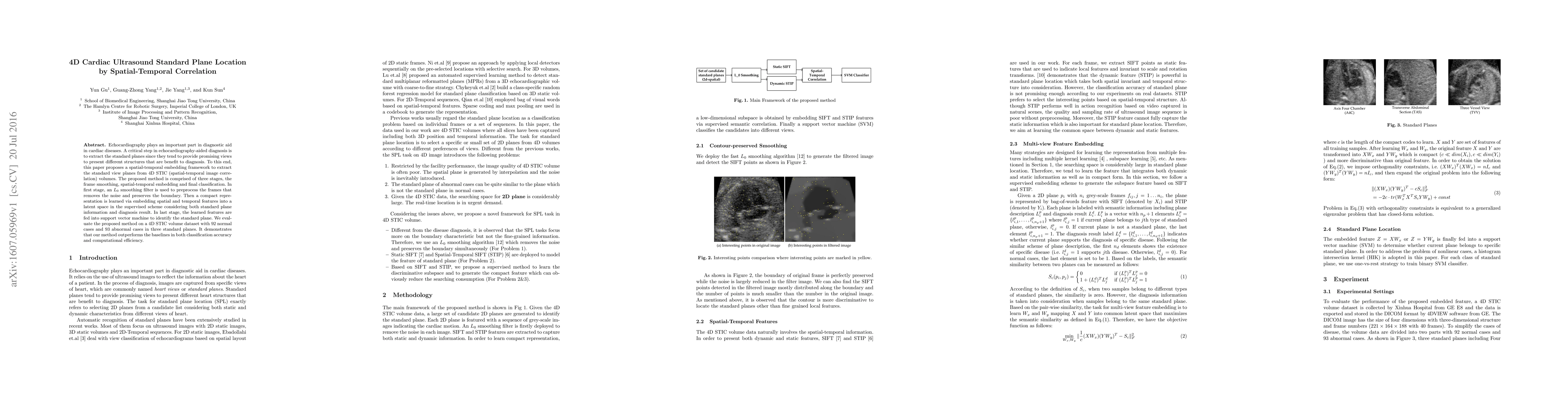 Echocardiography plays an important part in diagnostic aid in cardiac diseases. A critical step in echocardiography-aided diagnosis is to extract the standard planes since they tend to provide promising views to present different structures that are benefit to diagnosis. To this end, this paper proposes a spatial-temporal embedding framework to extract the standard view planes from 4D STIC (spatial-temporal image corre- lation) volumes. The proposed method is comprised of three stages, the frame smoothing, spatial-temporal embedding and final classification. In first stage, an L 0 smoothing filter is used to preprocess the frames that removes the noise and preserves the boundary. Then a compact repre- sentation is learned via embedding spatial and temporal features into a latent space in the supervised scheme considering both standard plane information and diagnosis result. In last stage, the learned features are fed into support vector machine to identify the standard plane. We eval- uate the proposed method on a 4D STIC volume dataset with 92 normal cases and 93 abnormal cases in three standard planes. It demonstrates that our method outperforms the baselines in both classification accuracy and computational efficiency.