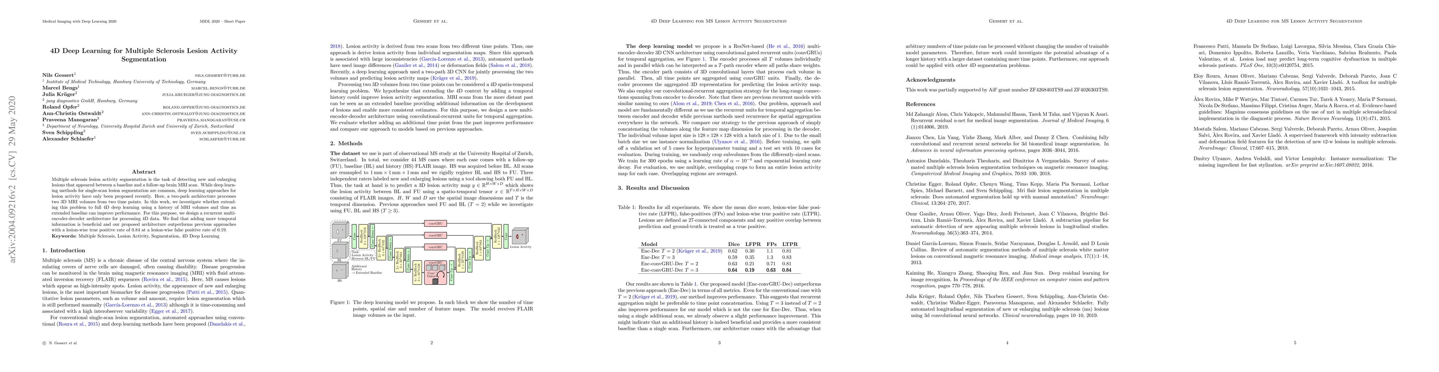 This research proposes a 4D deep learning approach for segmenting active lesions in multiple sclerosis using a recurrent multi-encoder-decoder architecture. It demonstrates that incorporating temporal information from multiple MRI scans enhances lesion activity detection, outperforming previous methods with a true positive rate of 0.84.
