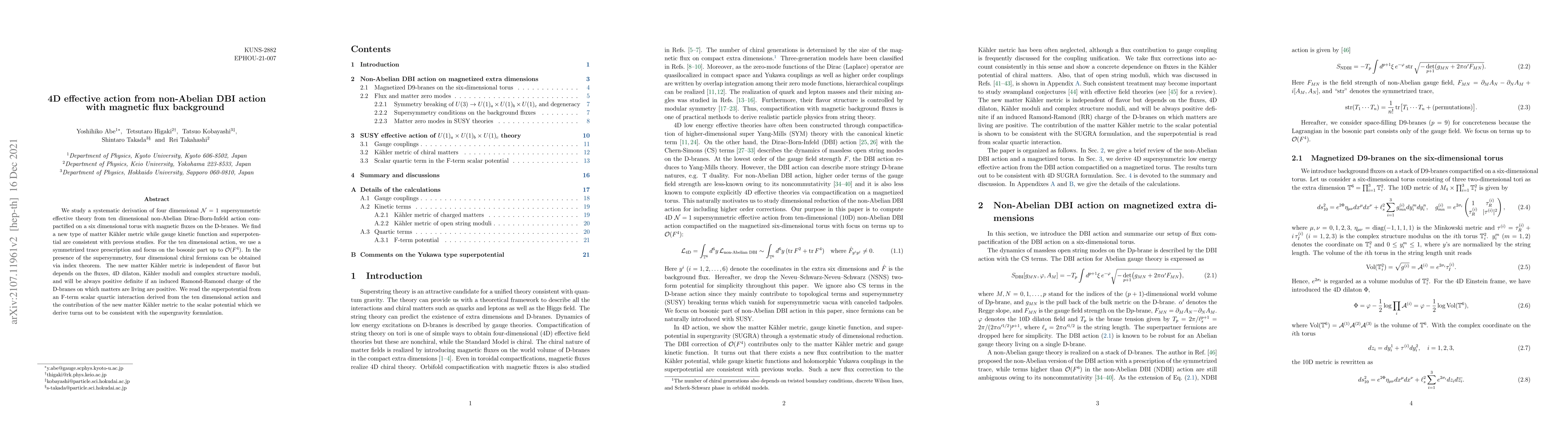 We study a systematic derivation of four dimensional $\mathcal{N}=1$ supersymmetric effective theory from ten dimensional non-Abelian Dirac-Born-Infeld action compactified on a six dimensional torus with magnetic fluxes on the D-branes. We find a new type of matter K\"{a}hler metric while gauge kinetic function and superpotential are consistent with previous studies. For the ten dimensional action, we use a symmetrized trace prescription and focus on the bosonic part up to $\mathcal{O}(F^4)$. In the presence of the supersymmetry, four dimensional chiral fermions can be obtained via index theorem. The new matter K\"{a}hler metric is independent of flavor but depends on the fluxes, 4D dilaton, K\"{a}hler moduli and complex structure moduli, and will be always positive definite if an induced Ramond-Ramond charge of the D-branes on which matters are living are positive. We read the superpotential from an F-term scalar quartic interaction derived from the ten dimensional action and the contribution of the new matter K\"{a}hler metric to the scalar potential which we derive turns out to be consistent with the supergravity formulation.