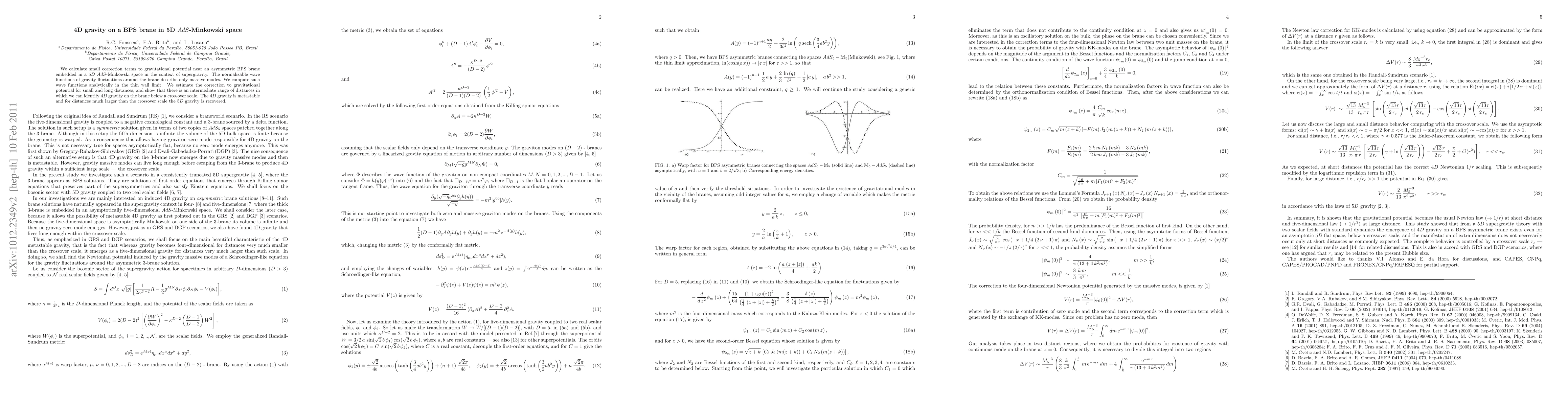 This paper calculates small correction terms to gravitational potential near a BPS brane in 5D AdS-Minkowski space, finding that an intermediate range of distances exhibits metastable 4D gravity before reverting to 5D gravity at larger scales. Analytical methods in the thin wall limit reveal normalizable wave functions describing only massive gravity modes.