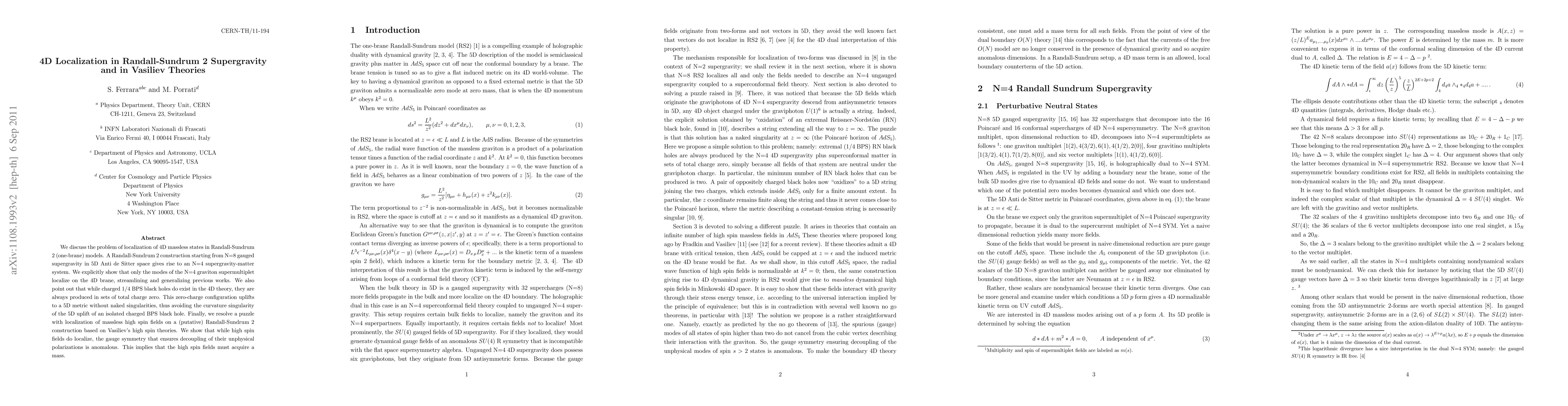 This paper examines the localization of 4D massless states in Randall-Sundrum 2 models, showing that only N=4 graviton modes localize on the brane. It also discusses the existence of zero-charge 4D black holes and resolves a puzzle regarding the localization of high spin fields in Vasiliev theories, revealing an anomalous gauge symmetry necessitating high spin field mass acquisition.