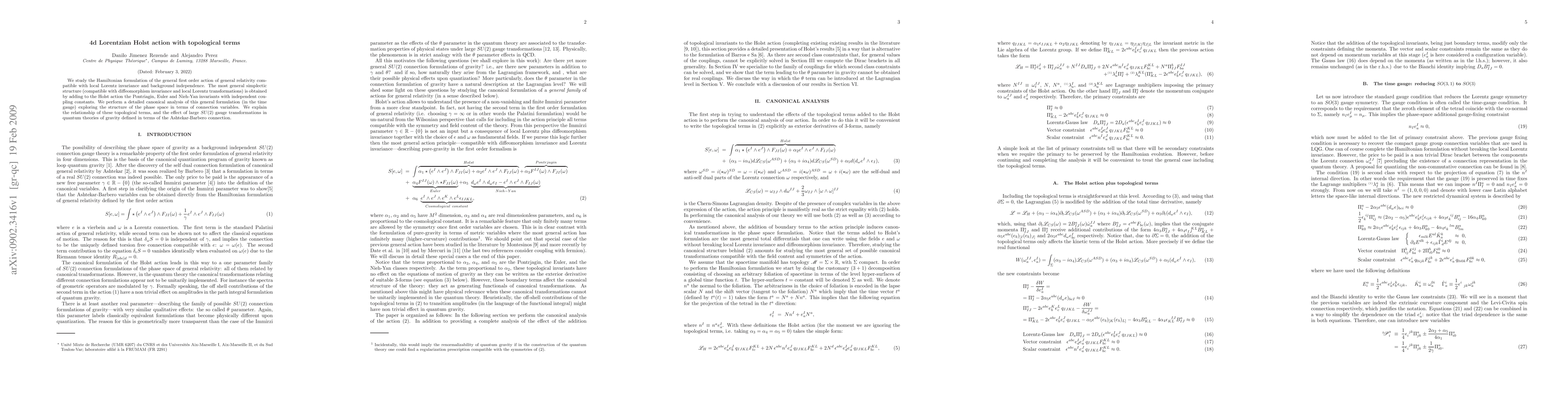 We study the Hamiltonian formulation of the general first order action of general relativity compatible with local Lorentz invariance and background independence. The most general simplectic structure (compatible with diffeomorphism invariance and local Lorentz transformations) is obtained by adding to the Holst action the Pontriagin, Euler and Nieh-Yan invariants with independent coupling constants. We perform a detailed canonical analysis of this general formulation (in the time gauge) exploring the structure of the phase space in terms of connection variables. We explain the relationship of these topological terms, and the effect of large SU(2) gauge transformations in quantum theories of gravity defined in terms of the Ashtekar-Barbero connection.