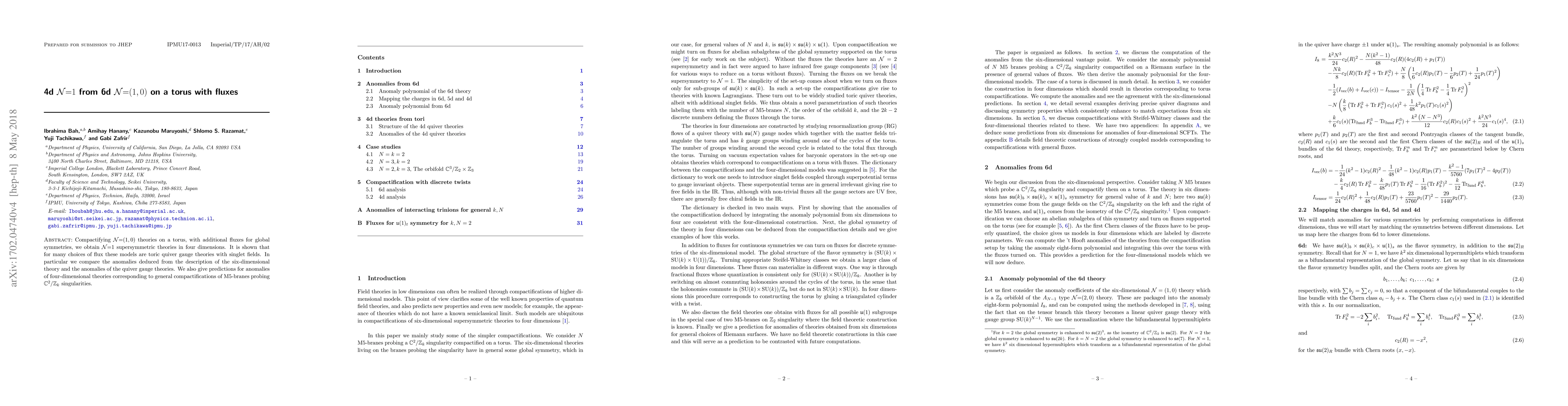 This paper explores the compactification of 6d N=(1,0) theories on a torus with fluxes to derive 4d N=1 supersymmetric theories, showing that many such models are toric quiver gauge theories with singlet fields. It also compares the anomalies from the six-dimensional theory with those of the resulting four-dimensional quiver gauge theories and predicts anomalies for general compactifications of M5-branes on C_2/Z_k singularities.