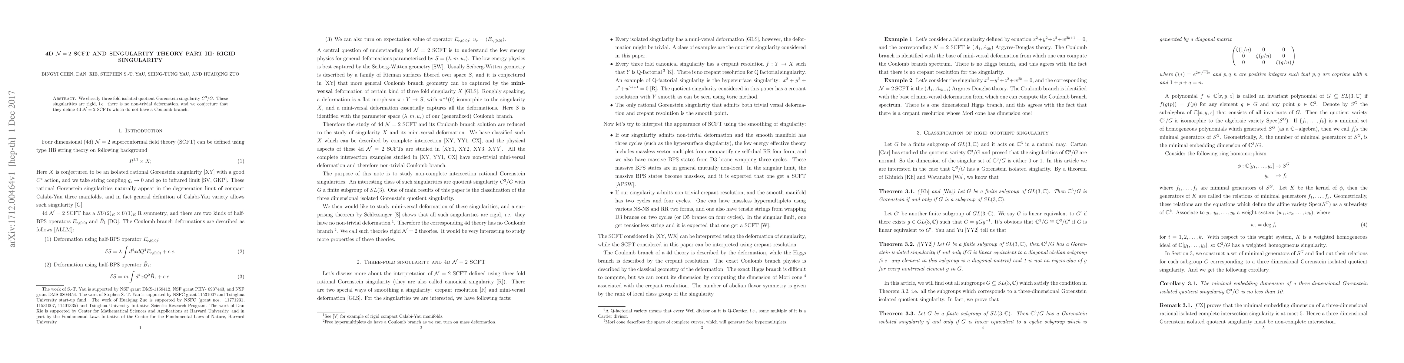 We classify three fold isolated quotient Gorenstein singularity $C^3/G$. These singularities are rigid, i.e. there is no non-trivial deformation, and we conjecture that they define 4d $\mathcal{N}=2$ SCFTs which do not have a Coulomb branch.