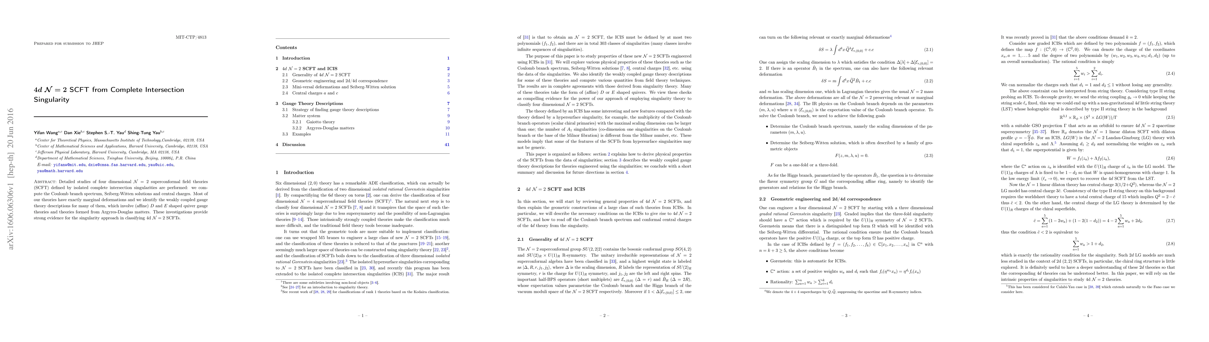 This paper explores four dimensional N=2 superconformal field theories arising from complete intersection singularities, detailing computations of their Coulomb branch spectrum, Seiberg-Witten solutions, and central charges. It identifies weakly coupled gauge theory descriptions, supporting the singularity approach for classifying such theories.