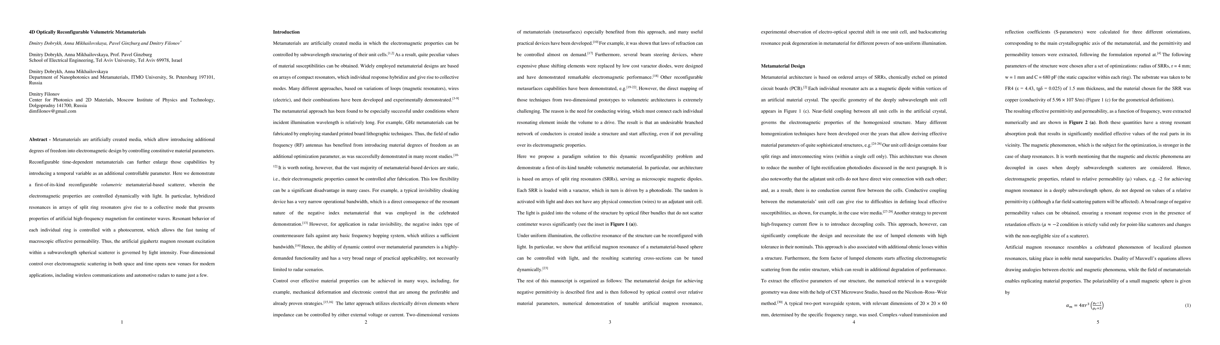 This research introduces a novel, light-controlled, volumetric metamaterial that dynamically adjusts its electromagnetic properties. By using photocurrents to tune resonant behaviors in split-ring arrays, the material exhibits artificial magnetism for centimeter waves, enabling four-dimensional control over scattering in space and time. This breakthrough could revolutionize wireless communications and automotive radar technologies.
