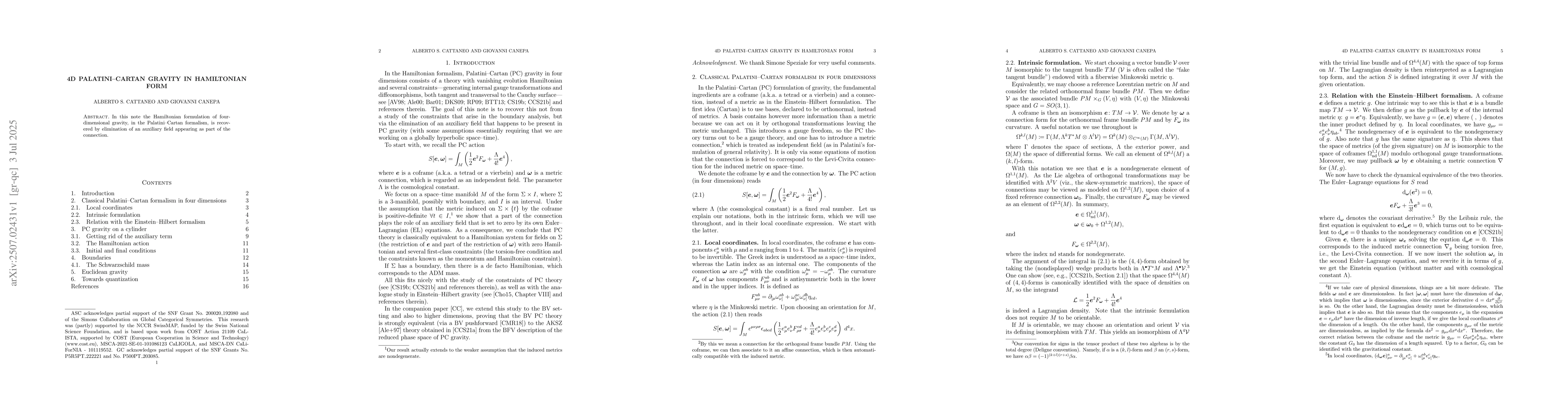 In this note the Hamiltonian formulation of four-dimensional gravity, in the Palatini-Cartan formalism, is recovered by elimination of an auxiliary field appearing as part of the connection.