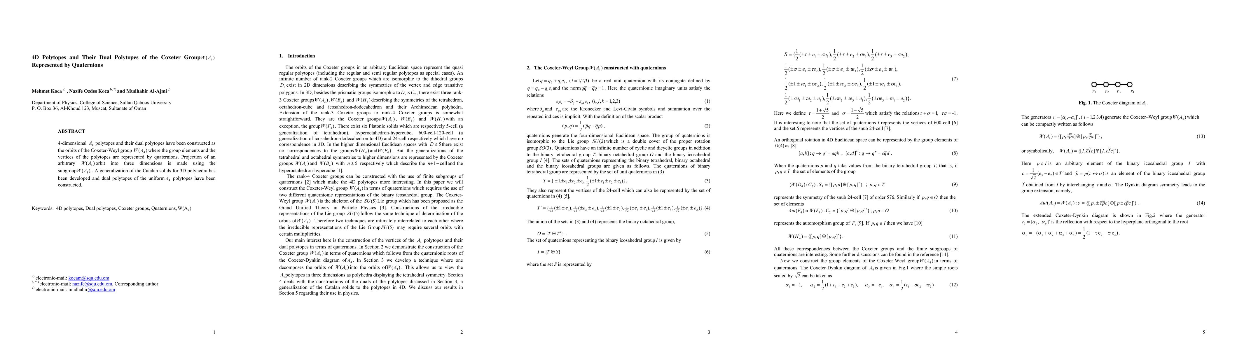 This paper constructs 4D $A_{4}$ polytopes and their duals using quaternion representations of the Coxeter-Weyl group $W(A_{4})$. It also develops a generalization of Catalan solids for 3D and projects $W(A_{4})$ orbits into three dimensions via $W(A_{3})$.