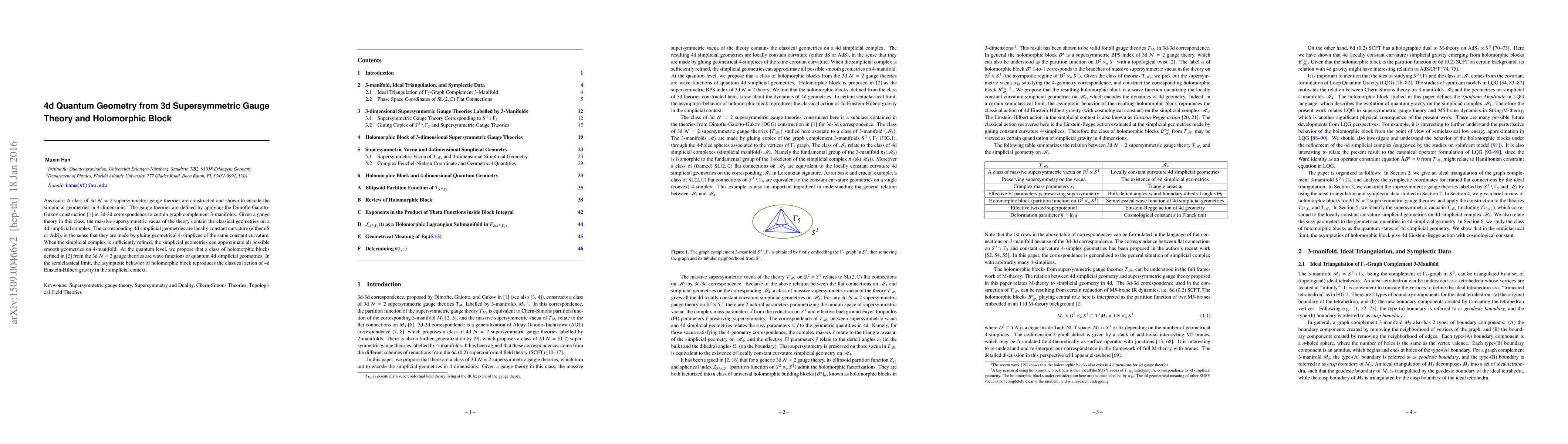 This paper constructs 3d $\mathcal{N}=2$ supersymmetric gauge theories that encode 4d simplicial geometries, showing that their massive vacua represent classical geometries on a 4d simplicial complex. It proposes that holomorphic blocks from these gauge theories serve as wave functions for quantum 4d simplicial geometries, with the asymptotic behavior of these blocks reproducing the classical action of 4d Einstein-Hilbert gravity in the simplicial context.