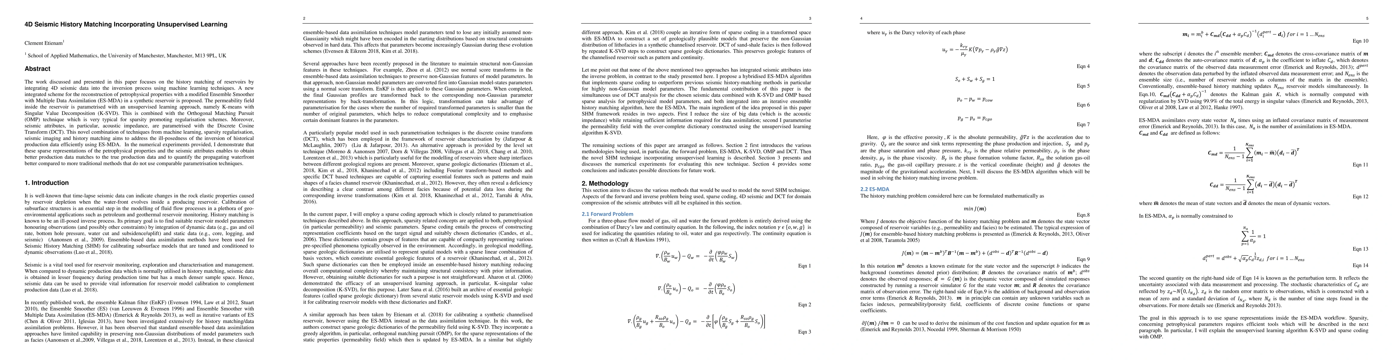 This paper proposes a novel 4D seismic history matching method integrating machine learning and unsupervised learning techniques, specifically using ES-MDA, K-SVD, OMP, and DCT. The approach demonstrates improved production data matching and better quantification of the propagating waterfront compared to traditional methods.
