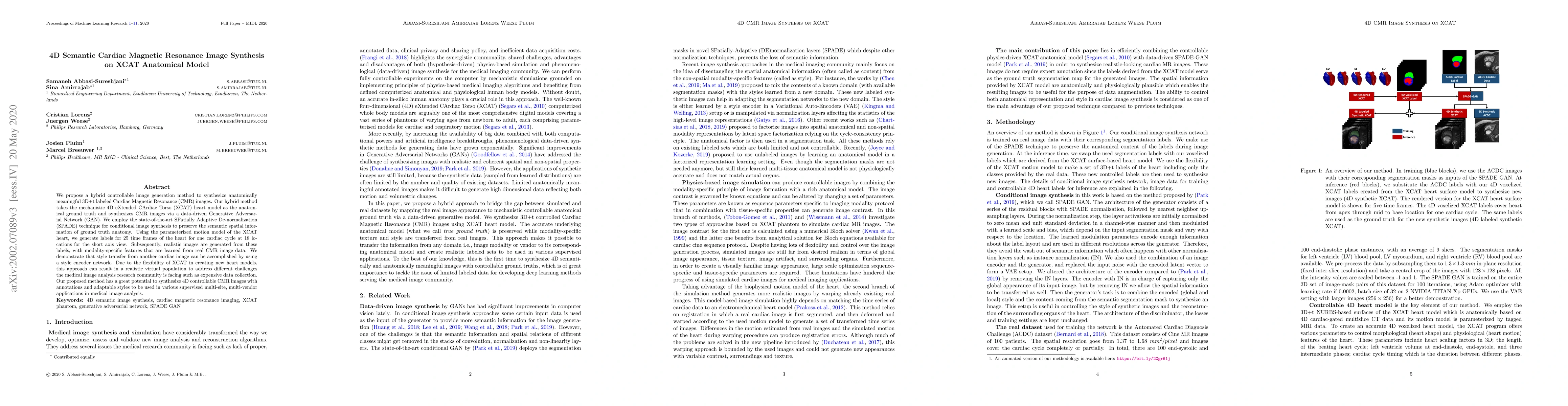 This paper proposes a hybrid method for synthesizing anatomically accurate 4D Cardiac Magnetic Resonance (CMR) images using a GAN and the XCAT anatomical model, employing the SPADE technique for semantic spatial information preservation. The method can generate realistic CMR images with modality-specific features and adaptable styles, potentially aiding in overcoming data collection challenges in medical imaging research.