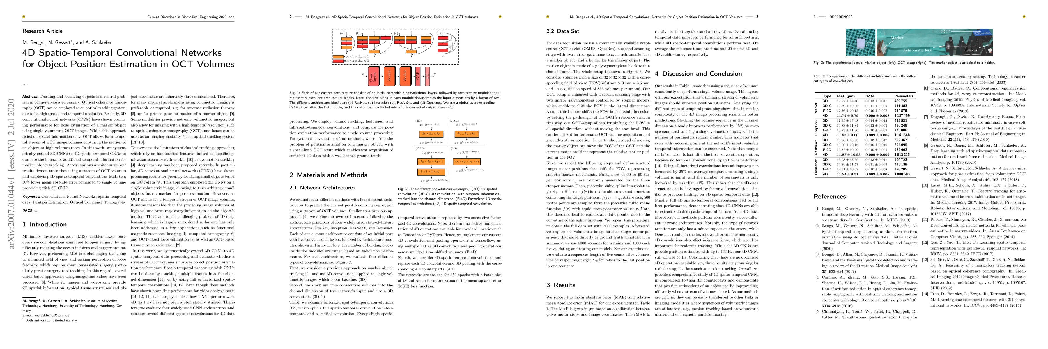 This paper proposes 4D spatio-temporal convolutional networks for improved object position estimation in OCT volumes. By incorporating temporal information from a stream of OCT volumes, the 4D CNNs achieve a 30% reduction in mean absolute error compared to 3D CNNs using single volumetric images.