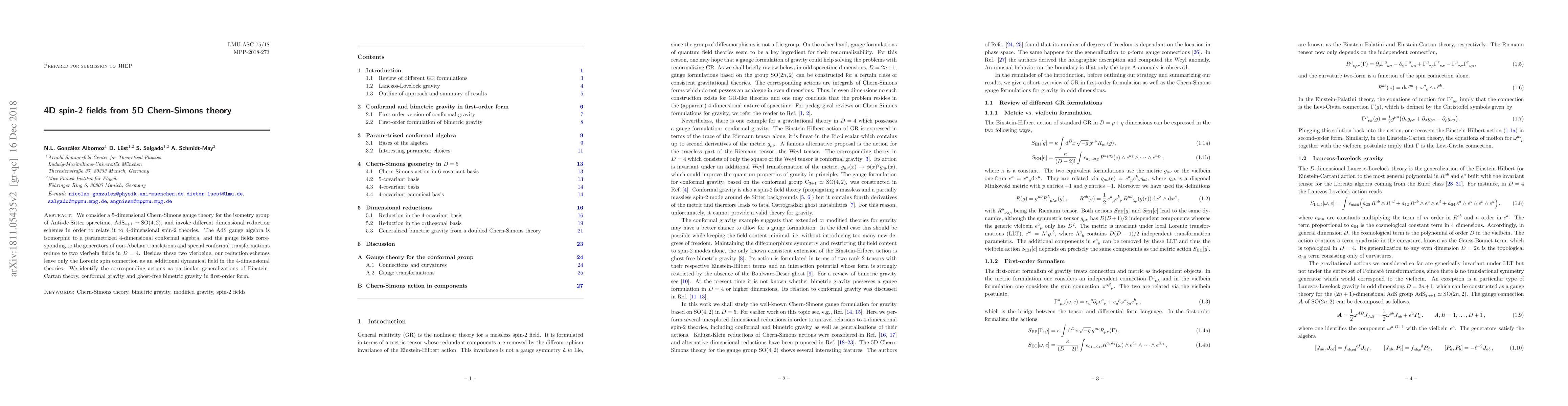 We consider a 5-dimensional Chern-Simons gauge theory for the isometry group of Anti-de-Sitter spacetime, $\operatorname{AdS}_{4+1}\simeq\operatorname{SO}(4,2)$, and invoke different dimensional reduction schemes in order to relate it to 4-dimensional spin-2 theories. The AdS gauge algebra is isomorphic to a parametrized 4-dimensional conformal algebra, and the gauge fields corresponding to the generators of non-Abelian translations and special conformal transformations reduce to two vierbein fields in $D=4$. Besides these two vierbeine, our reduction schemes leave only the Lorentz spin connection as an additional dynamical field in the 4-dimensional theories. We identify the corresponding actions as particular generalizations of Einstein-Cartan theory, conformal gravity and ghost-free bimetric gravity in first-order form.