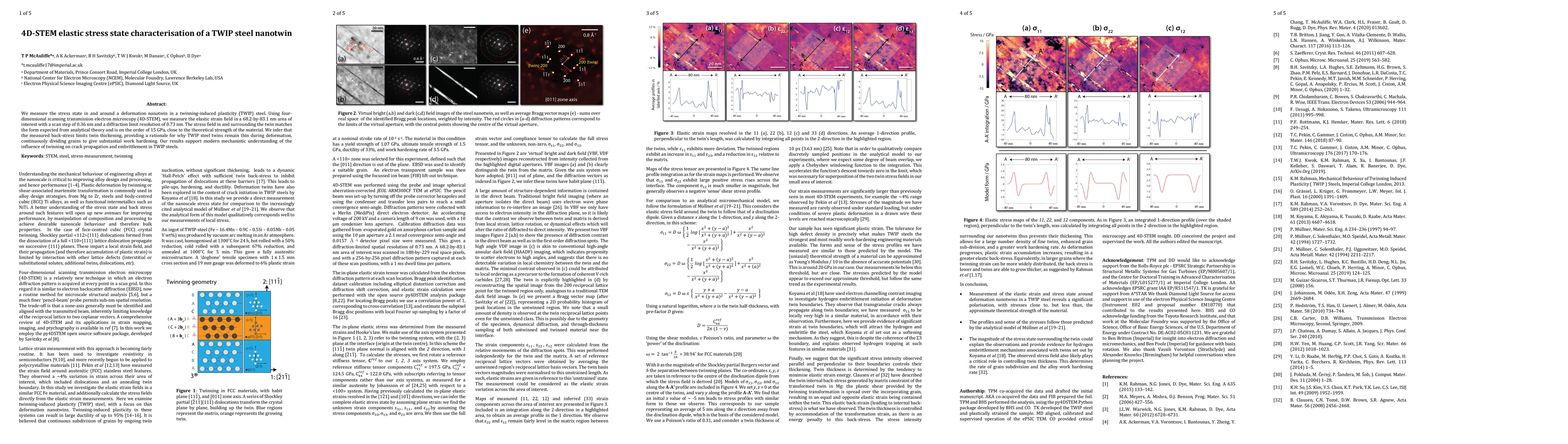 We measure the stress state in and around a deformation nanotwin in a twinning-induced plasticity (TWIP) steel. Using four-dimensional scanning transmission electron microscopy (4D-STEM), we measure the elastic strain field in a 68.2-by-83.1 nm area of interest with a scan step of 0.36 nm and a diffraction limit resolution of 0.73 nm. The stress field in and surrounding the twin matches the form expected from analytical theory and is on the order of 15 GPa, close to the theoretical strength of the material. We infer that the measured back-stress limits twin thickening, providing a rationale for why TWIP steel twins remain thin during deformation, continuously dividing grains to give substantial work hardening. Our results support modern mechanistic understanding of the influence of twinning on crack propagation and embrittlement in TWIP steels.