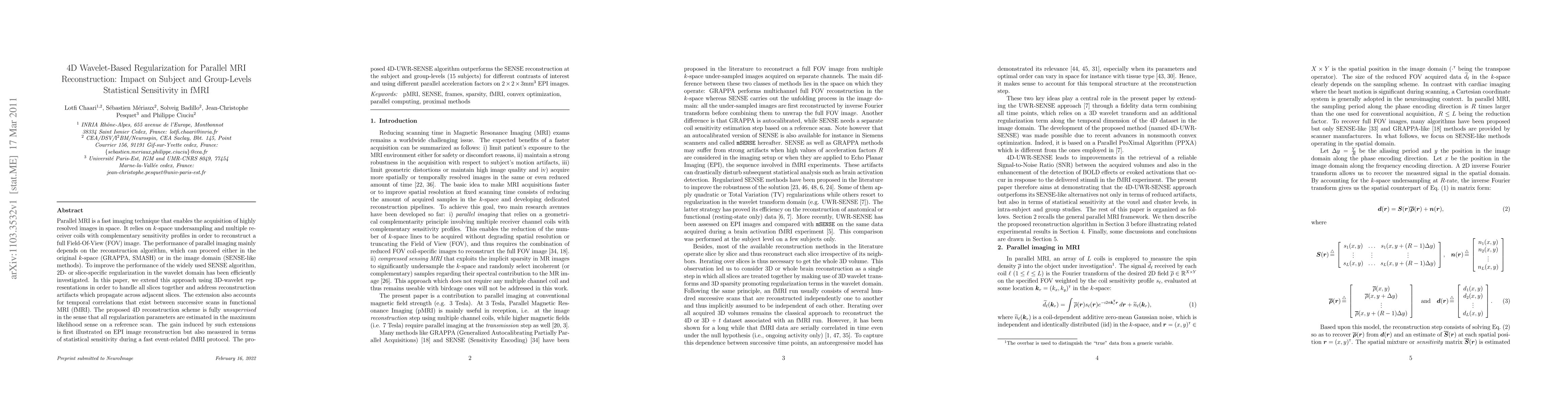 This paper proposes a 4D wavelet-based regularization method for parallel MRI reconstruction, improving the SENSE algorithm by addressing reconstruction artifacts across slices and temporal correlations in fMRI. The 4D-UWR-SENSE algorithm shows enhanced statistical sensitivity at both subject and group levels during fast event-related fMRI protocols compared to traditional SENSE reconstruction.