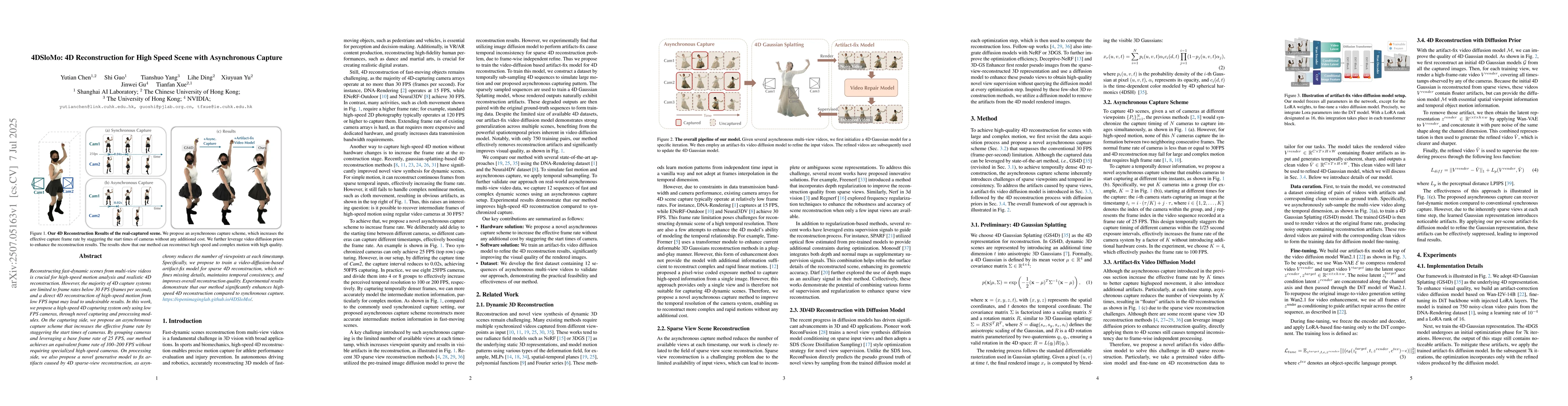 Reconstructing fast-dynamic scenes from multi-view videos is crucial for high-speed motion analysis and realistic 4D reconstruction. However, the majority of 4D capture systems are limited to frame rates below 30 FPS (frames per second), and a direct 4D reconstruction of high-speed motion from low FPS input may lead to undesirable results. In this work, we propose a high-speed 4D capturing system only using low FPS cameras, through novel capturing and processing modules. On the capturing side, we propose an asynchronous capture scheme that increases the effective frame rate by staggering the start times of cameras. By grouping cameras and leveraging a base frame rate of 25 FPS, our method achieves an equivalent frame rate of 100-200 FPS without requiring specialized high-speed cameras. On processing side, we also propose a novel generative model to fix artifacts caused by 4D sparse-view reconstruction, as asynchrony reduces the number of viewpoints at each timestamp. Specifically, we propose to train a video-diffusion-based artifact-fix model for sparse 4D reconstruction, which refines missing details, maintains temporal consistency, and improves overall reconstruction quality. Experimental results demonstrate that our method significantly enhances high-speed 4D reconstruction compared to synchronous capture.