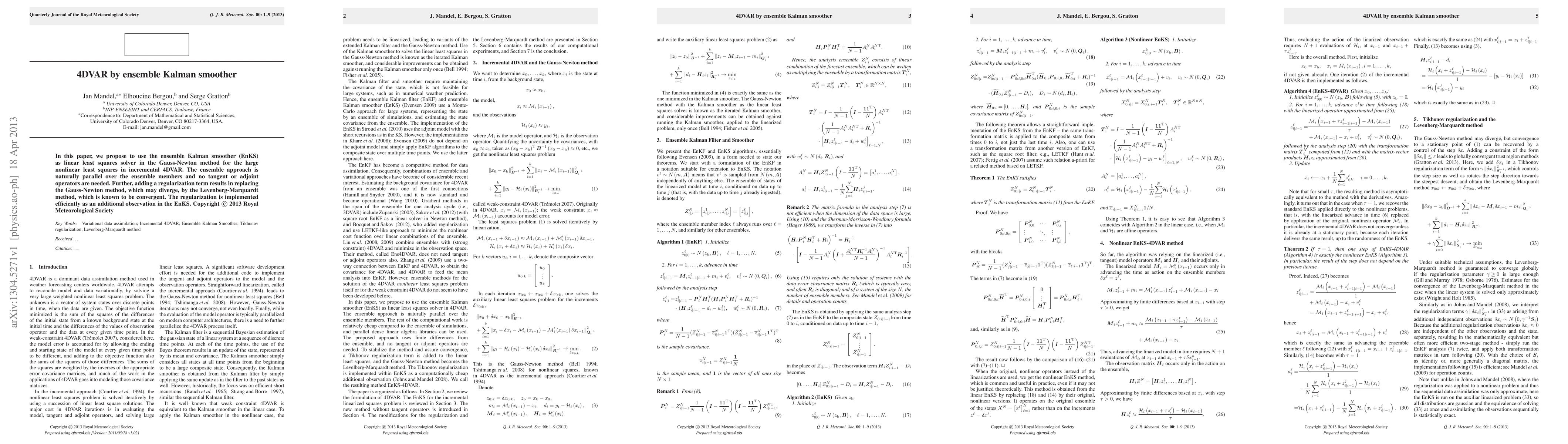 The paper proposes using the Ensemble Kalman Smoother (EnKS) as a linear least squares solver in the Gauss-Newton method for large nonlinear least squares in incremental 4DVAR, eliminating the need for tangent or adjoint operators and replacing the potentially divergent Gauss-Newton method with the convergent Levenberg-Marquardt method through regularization.