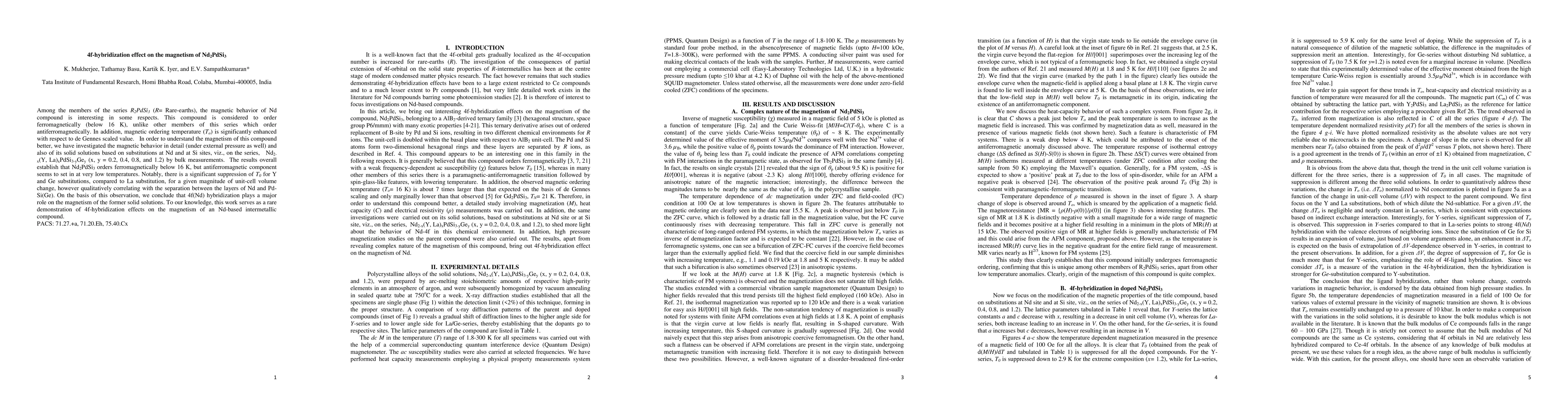 Among the members of the series R2PdSi3 (R= Rare-earths), the magnetic behavior of the Nd compound is interesting in some respects. This compound is considered to order ferromagnetically (below 16 K), unlike other members of this series which order antiferromagnetically. In addition, magnetic ordering temperature (To) is significantly enhanced with respect to de Gennes scaled value. In order to understand the magnetism of this compound better, we have investigated the magnetic behavior in detail (under external pressure as well) and also of its solid solutions based on substitutions at Nd and at Si sites, viz., on the series, Nd(2-x)(Y,La)(x)PdSi(3-y)Ge(y) (x, y= 0.2, 0.4, 0.8, and 1.2) by bulk measurements. The results overall establish that Nd2PdSi3 orders ferromagnetically below 16 K, but antiferromagnetic component seems to set in at very low temperatures. Notably, there is a significant suppression of To for Y and Ge substitutions, compared to La substitution, for a given magnitude of unit-cell volume change, however qualitatively correlating with the separation between the layers of Nd and Pd-Si(Ge). On the basis of this observation, we conclude that 4f(Nd) hybridization plays a major role on the magnetism of the former solid solutions. To our knowledge, this work serves as a rare demonstration of 4f-hybridization effects on the magnetism of a Nd-based intermetallic compound.