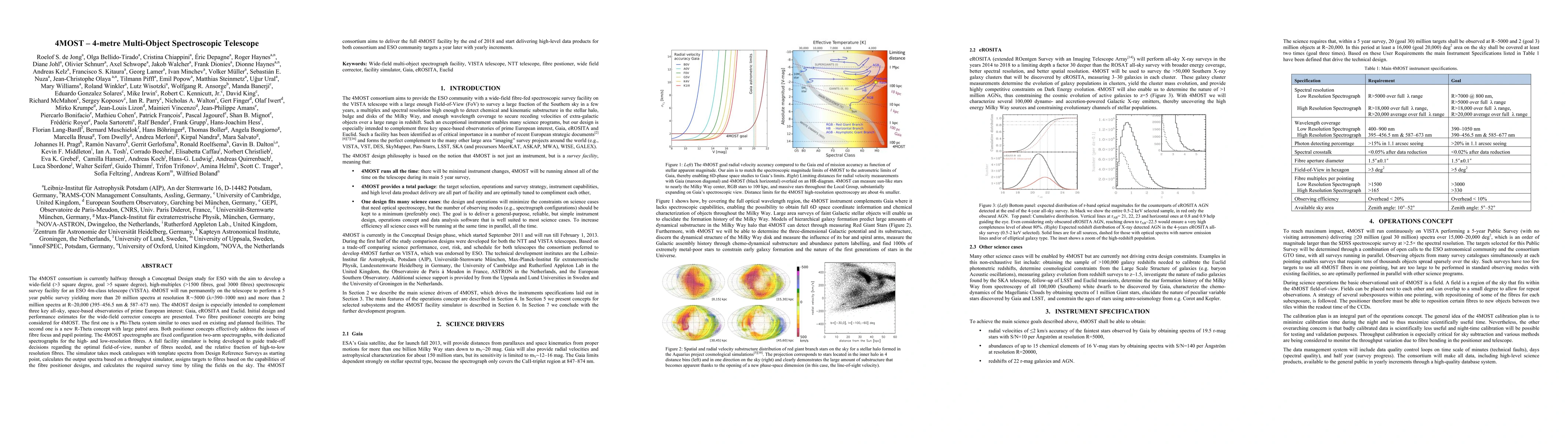 The 4MOST consortium is currently halfway through a Conceptual Design study for ESO with the aim to develop a wide-field (>3 square degree, goal >5 square degree), high-multiplex (>1500 fibres, goal 3000 fibres) spectroscopic survey facility for an ESO 4m-class telescope (VISTA). 4MOST will run permanently on the telescope to perform a 5 year public survey yielding more than 20 million spectra at resolution R~5000 ({\lambda}=390-1000 nm) and more than 2 million spectra at R~20,000 (395-456.5 nm & 587-673 nm). The 4MOST design is especially intended to complement three key all-sky, space-based observatories of prime European interest: Gaia, eROSITA and Euclid. Initial design and performance estimates for the wide-field corrector concepts are presented. We consider two fibre positioner concepts, a well-known Phi-Theta system and a new R-Theta concept with a large patrol area. The spectrographs are fixed configuration two-arm spectrographs, with dedicated spectrographs for the high- and low-resolution. A full facility simulator is being developed to guide trade-off decisions regarding the optimal field-of-view, number of fibres needed, and the relative fraction of high-to-low resolution fibres. Mock catalogues with template spectra from seven Design Reference Surveys are simulated to verify the science requirements of 4MOST. The 4MOST consortium aims to deliver the full 4MOST facility by the end of 2018 and start delivering high-level data products for both consortium and ESO community targets a year later with yearly increments.