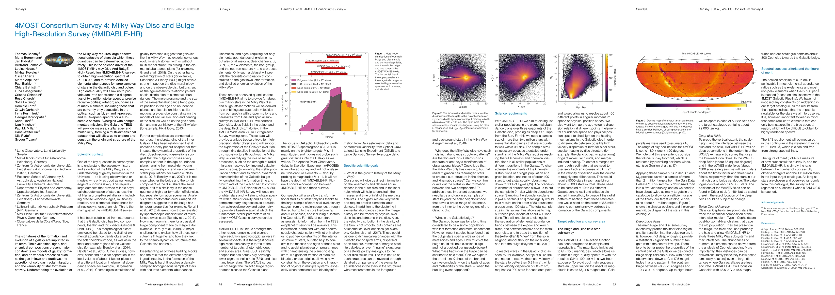The 4MIDABLE-HR survey aims to obtain high-resolution spectra of two million stars in the Milky Way's disc and bulge to determine their precise radial velocities, elemental abundances, and rotation rates, thereby enhancing our understanding of the galaxy's formation and evolution. This dataset will be complemented by data from missions like Gaia and TESS to provide a comprehensive view of the Milky Way's structure and history.