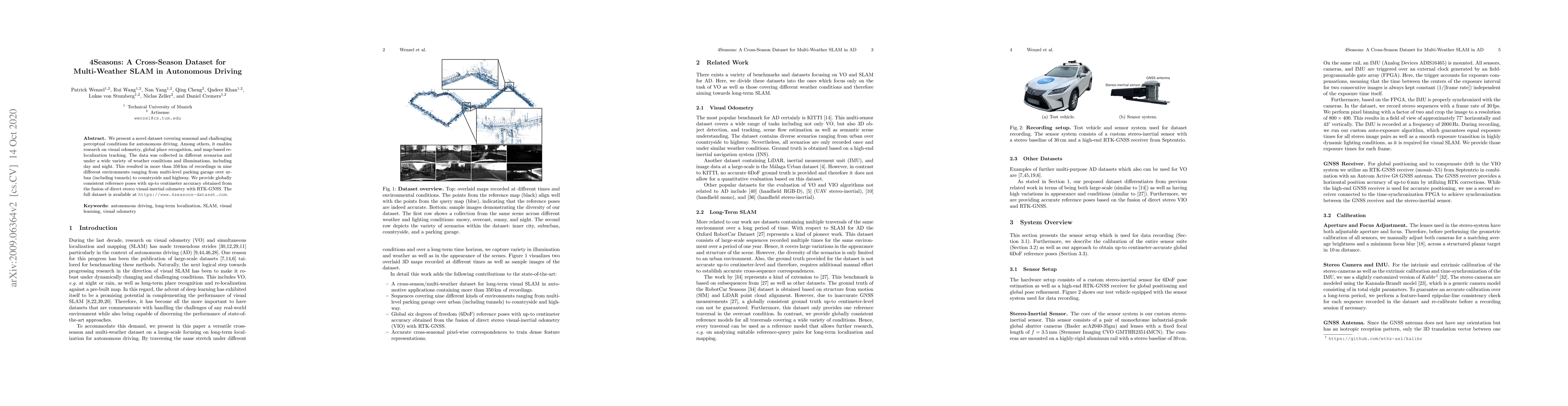 The 4Seasons dataset offers a comprehensive collection of multi-seasonal and diverse weather conditions for autonomous driving research, featuring over 350 km of recordings across various environments. It includes globally consistent reference poses, enabling studies in visual odometry, place recognition, and map-based re-localization.