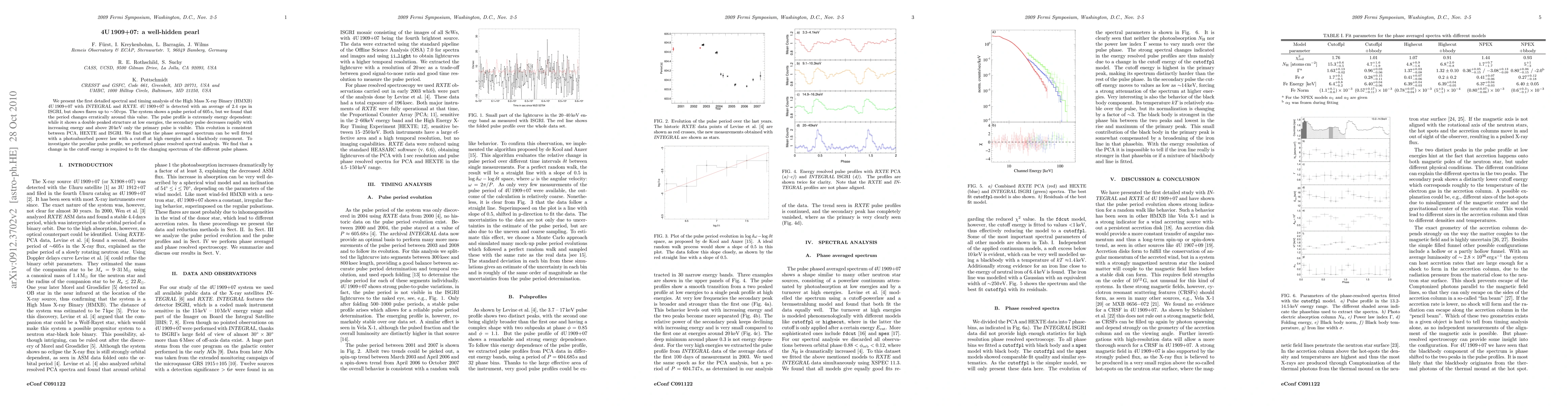 The research analyzes 4U 1909+07, a High Mass X-ray Binary, using INTEGRAL and RXTE data. Key findings include an erratic pulse period around 605s, an energy-dependent pulse profile, and a phase-resolved spectral analysis revealing changes in cutoff energy across pulse phases. The spectrum is best fit with a photoabsorbed power law and blackbody component.