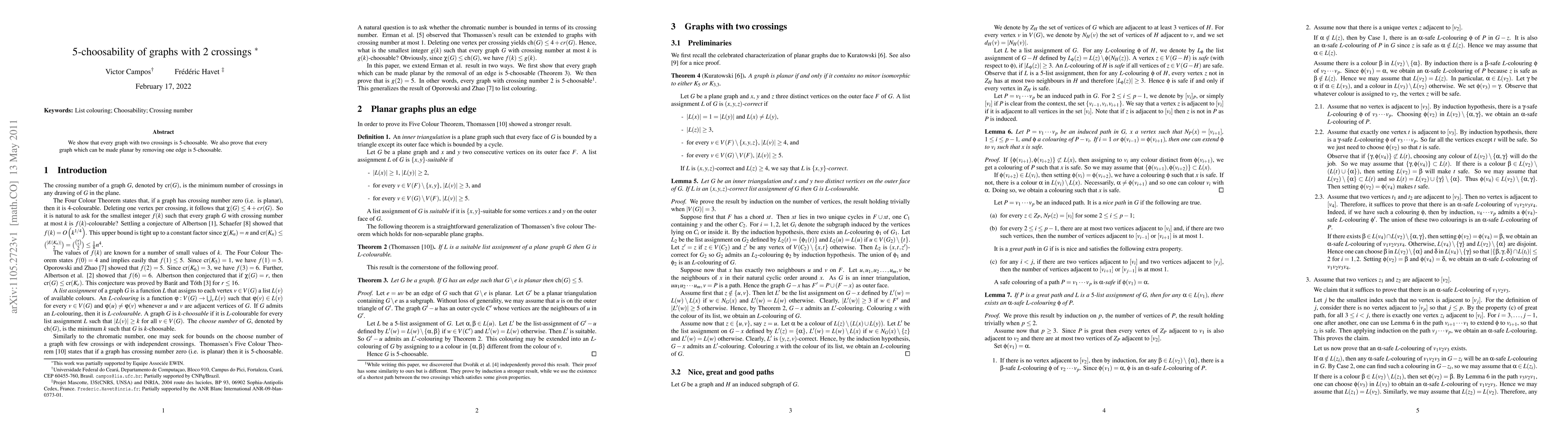 We show that every graph with two crossings is 5-choosable. We also prove that every graph which can be made planar by removing one edge is 5-choosable.