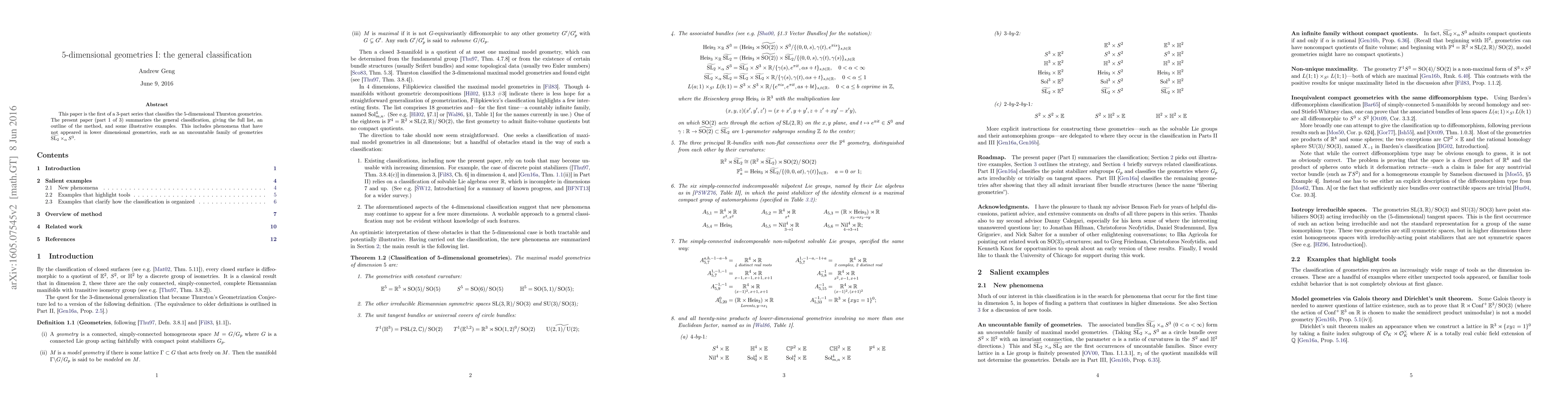 This paper classifies the 5-dimensional Thurston geometries, presenting a comprehensive list and outlining the classification method. It includes novel phenomena such as an uncountable family of geometries not seen in lower dimensions.