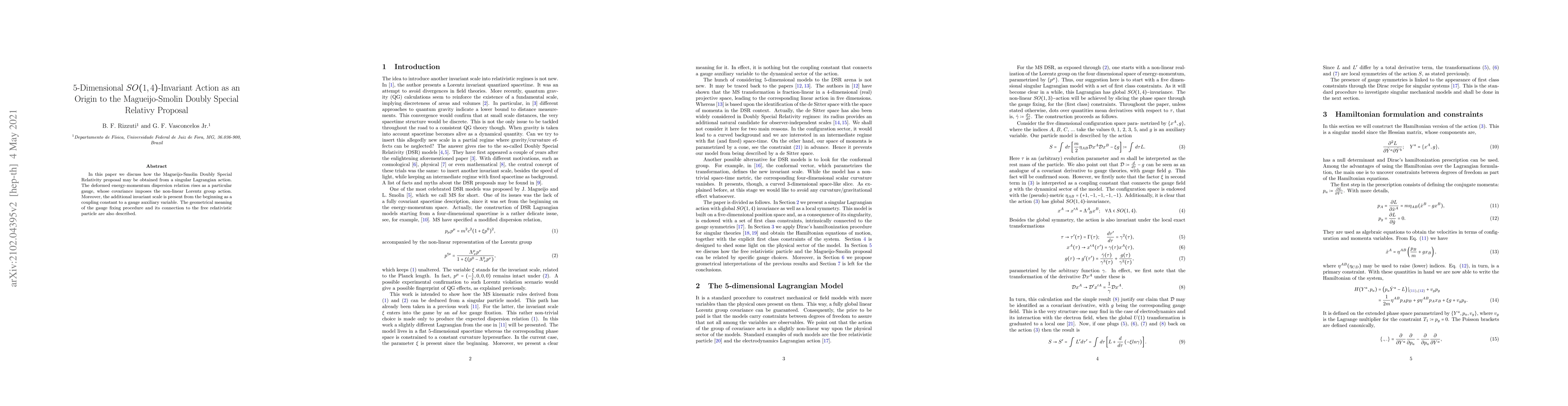 In this paper we discuss how the Magueijo-Smolin Doubly Special Relativity proposal may obtained from a singular Lagrangian action. The deformed energy-momentum dispersion relation rises as a particular gauge, whose covariance imposes the non-linear Lorentz group action. Moreover, the additional invariant scale is present from the beginning as a coupling constant to a gauge auxiliary variable. The geometrical meaning of the gauge fixing procedure and its connection to the free relativistic particle are also described.