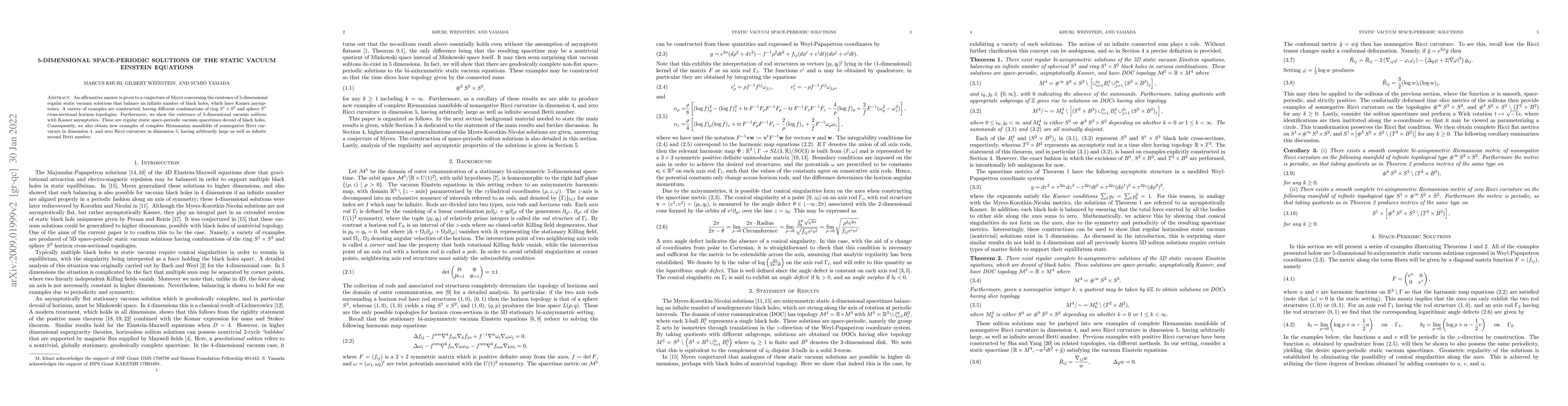 An affirmative answer is given to a conjecture of Myers concerning the existence of 5-dimensional regular static vacuum solutions that balance an infinite number of black holes, which have Kasner asymptotics. A variety of examples are constructed, having different combinations of ring $S^1\times S^2$ and sphere $S^3$ cross-sectional horizon topologies. Furthermore, we show the existence of 5-dimensional vacuum solitons with Kasner asymptotics. These are regular static space-periodic vacuum spacetimes devoid of black holes. Consequently, we also obtain new examples of complete Riemannian manifolds of nonnegative Ricci curvature in dimension 4, and zero Ricci curvature in dimension 5, having arbitrarily large as well as infinite second Betti number.