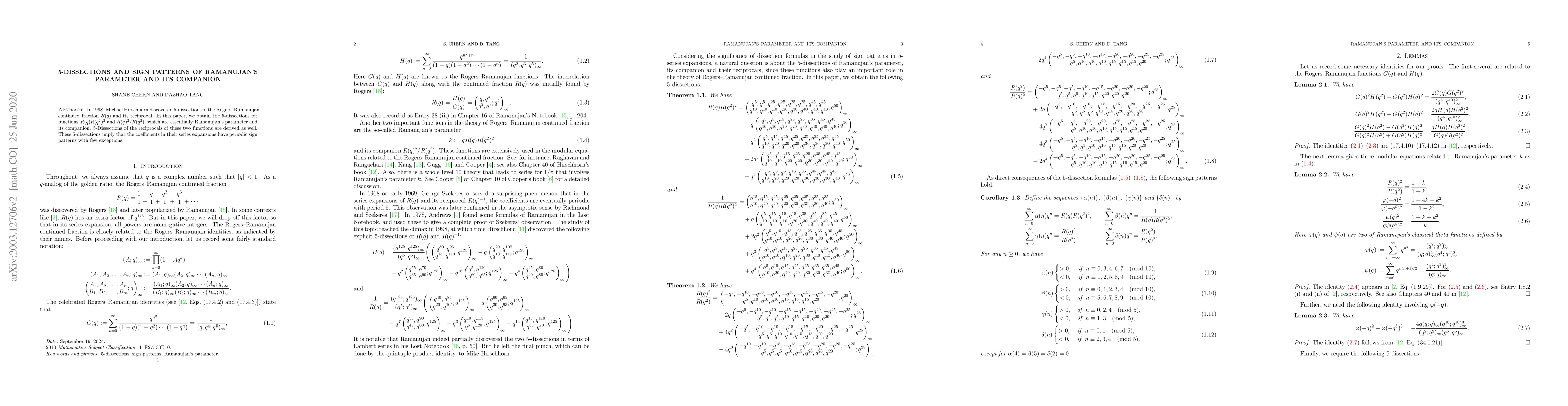 Researchers found 5-dissections for Ramanujan's parameter and its companion functions, revealing periodic sign patterns in their series expansions.