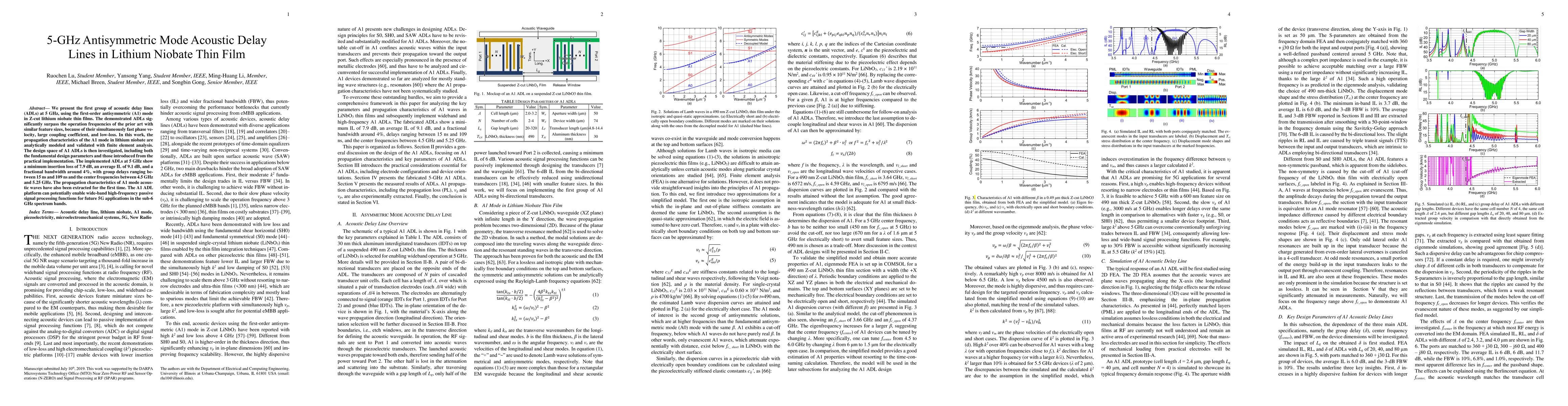 The research presents the first group of acoustic delay lines (ADLs) at 5 GHz using the first-order antisymmetric (A1) mode in Z-cut lithium niobate thin films. The propagation characteristics of the A1 mode in lithium niobate are analytically modeled and validated with finite element analysis (FEA).