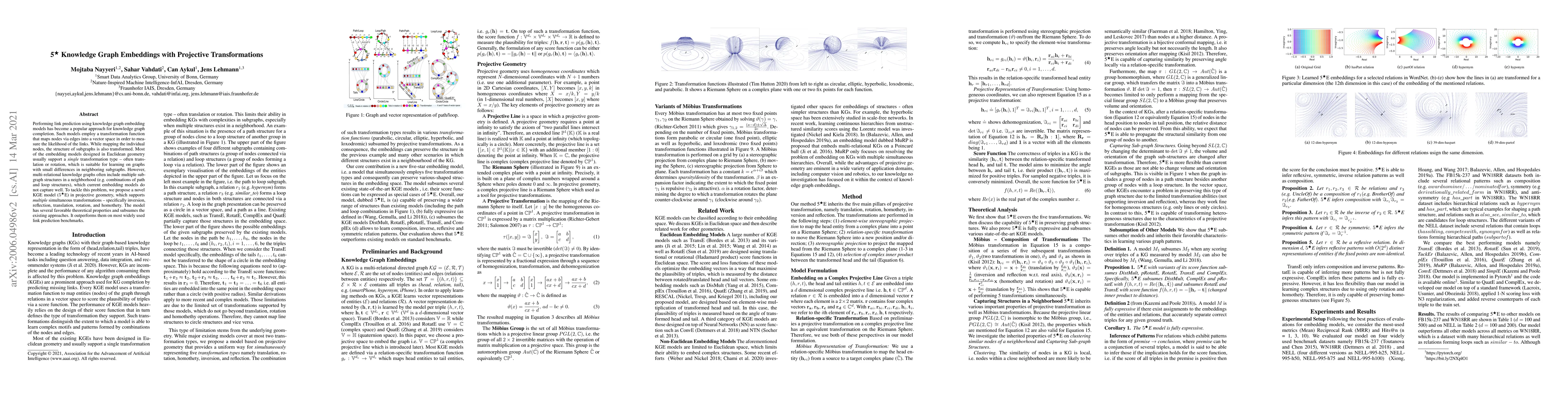Performing link prediction using knowledge graph embedding models has become a popular approach for knowledge graph completion. Such models employ a transformation function that maps nodes via edges into a vector space in order to measure the likelihood of the links. While mapping the individual nodes, the structure of subgraphs is also transformed. Most of the embedding models designed in Euclidean geometry usually support a single transformation type - often translation or rotation, which is suitable for learning on graphs with small differences in neighboring subgraphs. However, multi-relational knowledge graphs often include multiple sub-graph structures in a neighborhood (e.g. combinations of path and loop structures), which current embedding models do not capture well. To tackle this problem, we propose a novel KGE model (5*E) in projective geometry, which supports multiple simultaneous transformations - specifically inversion, reflection, translation, rotation, and homothety. The model has several favorable theoretical properties and subsumes the existing approaches. It outperforms them on the most widely used link prediction benchmarks