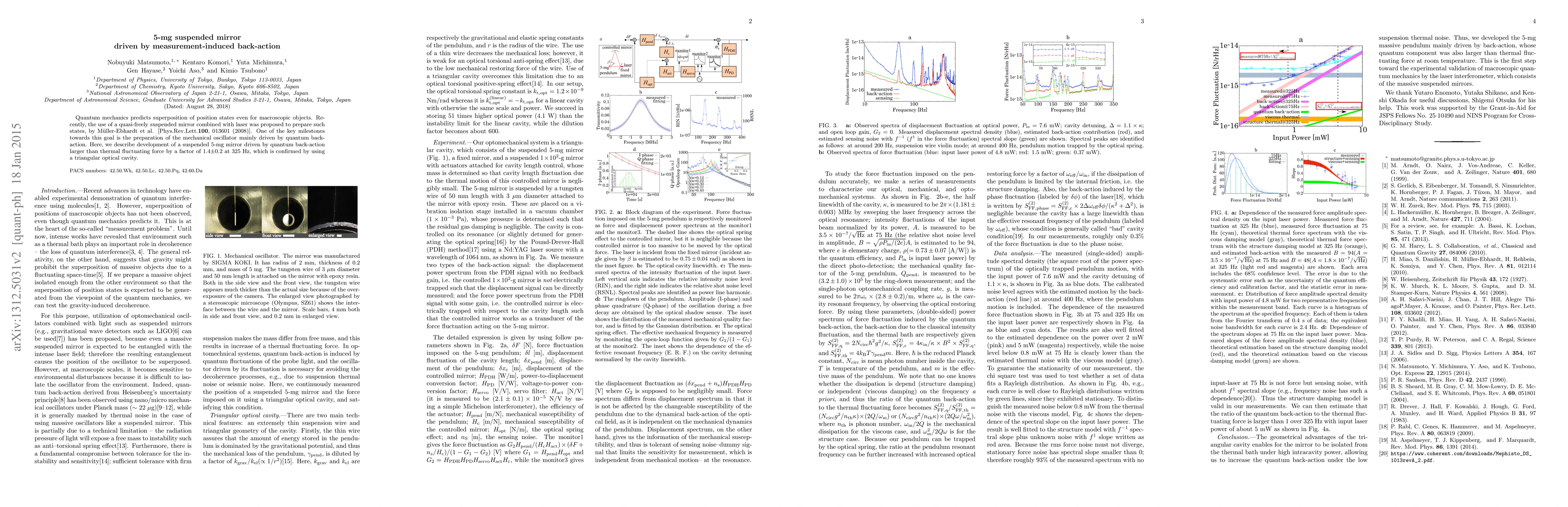 Quantum mechanics predicts superposition of position states even for macroscopic objects. Recently, the use of a quasi-freely suspended mirror combined with laser was proposed to prepare such states, by M\"uller-Ebhardt et al. [Phys.Rev.Lett.100, 013601 (2008)]. One of the key milestones towards this goal is the preparation of the mechanical oscillator mainly driven by quantum back-action, which identifies the connection between the object and quantumness of the light. Here, we describe development of a suspended 5-mg mirror driven by quantum back-action larger than thermal fluctuating force by a factor of 1.4$\pm$0.2 at 325 Hz,which is confirmed by using a triangular optical cavity.