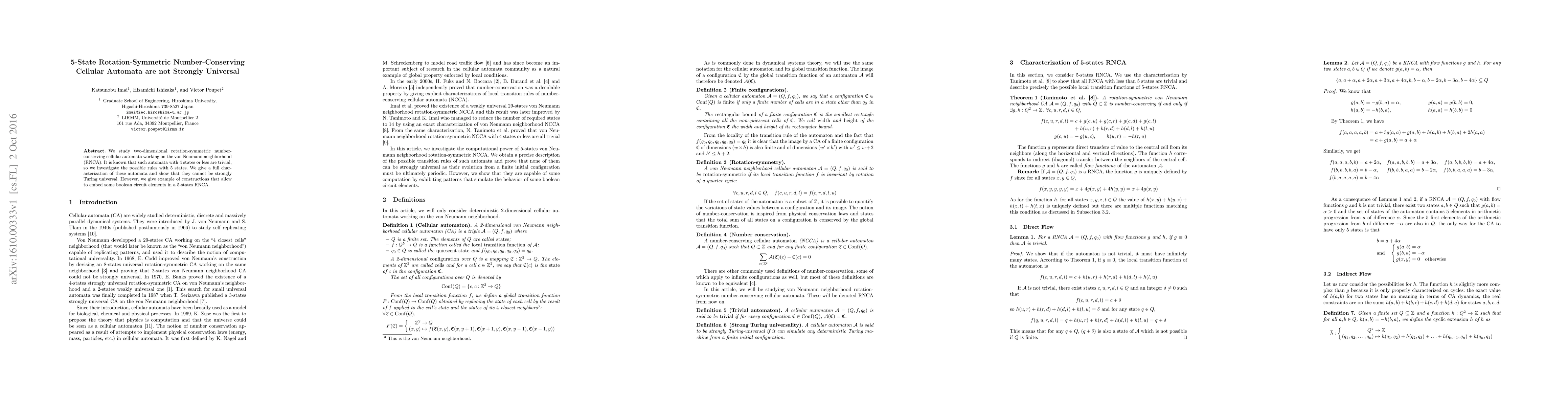 This paper characterizes 5-state rotation-symmetric number-conserving cellular automata (RNCA) and demonstrates they lack strong Turing universality. Despite this, the authors provide examples of embedding boolean circuit elements within these automata.