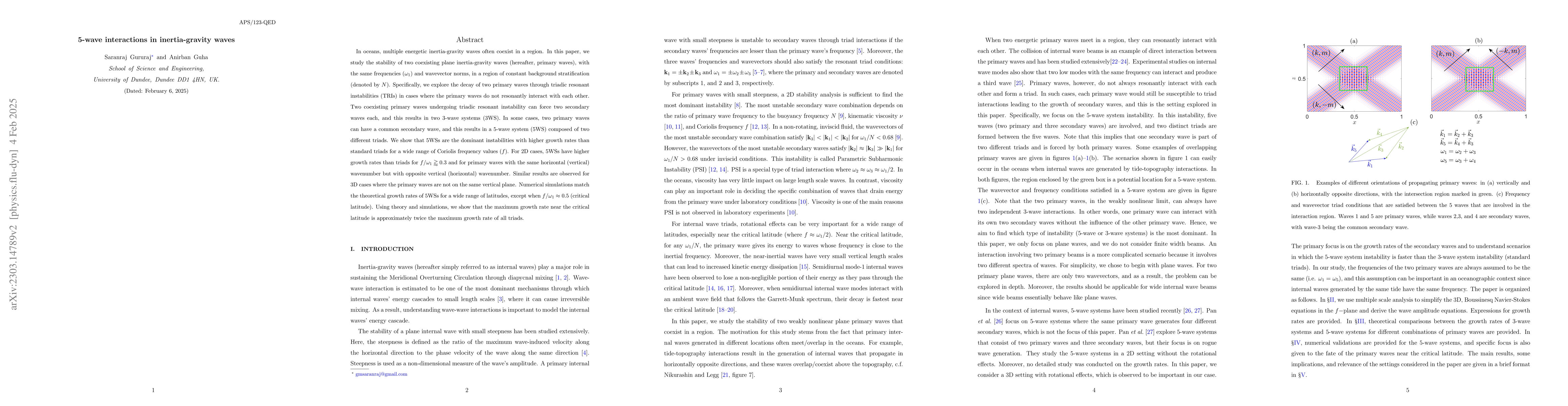 We use multiple-scale analysis to study a 5-wave system (5WS) composed of two different internal gravity wave triads. Each of these triads consists of a parent wave and two daughter waves, with one daughter wave common between the two triads. The parent waves are assumed to have the same frequency and wavevector norm co-existing in a region of constant background stratification. Such 5-wave systems may emerge in oceans, for example, via tide-topography interactions, generating multiple parent internal waves that overlap. Two 2D cases are considered: Case 1(2) has parent waves with the same horizontal (vertical) wavenumber but with different vertical (horizontal) wavenumber. For both cases, the 5WS is more unstable than triads for $f/\omega_1\gtrapprox0.3$, where $\omega_1$ and $f$ are the parent wave and the local Coriolis frequency, respectively. For $f/\omega_1\gtrapprox0.3$, the common daughter wave's frequency is $\approx \omega_1-f $ and $f$ respectively for Cases 1 and 2. For 3D cases, 5WSs become more unstable as the angle ($\theta$) between the horizontal wavevectors of the parent waves is decreased. Moreover, for any $\theta$, 5WSs have higher growth rates than triads for $f/\omega_1\gtrapprox0.3$. Numerical simulations match the theoretical growth rates of 5WSs for a wide range of latitudes, except when $f/\omega_1\approx0.5$ (critical latitude). More than three daughter waves are forced by the two parent waves when $f/\omega_1\approx0.5$. We formulate a reduced order model which shows that for any $\theta$, the maximum growth rate near the critical latitude is approximately twice the maximum growth rate of all triads.