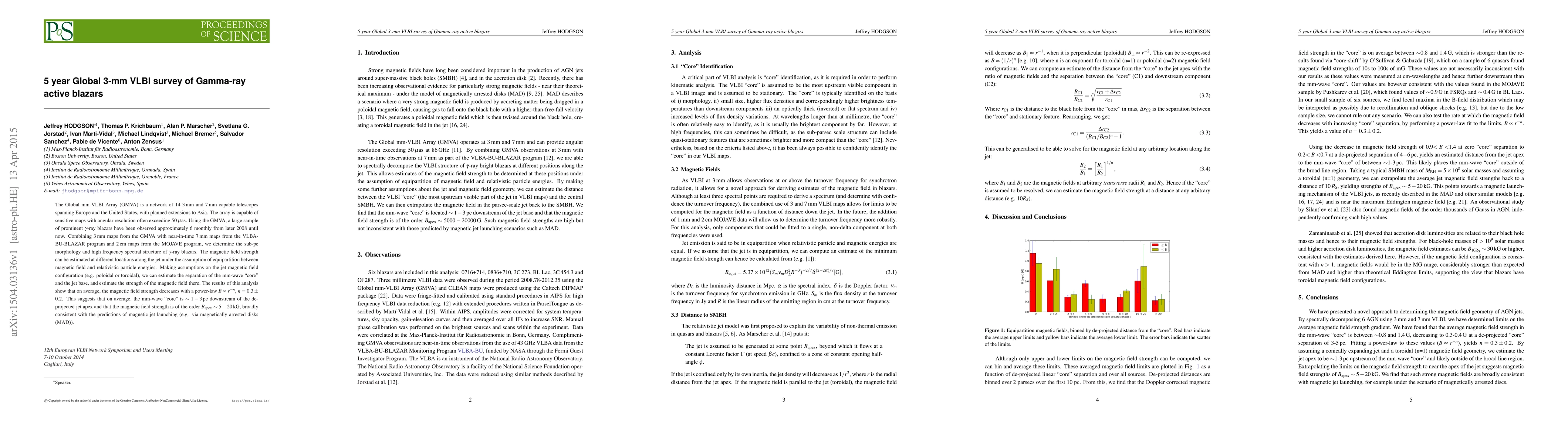 A 5-year global survey of gamma-ray active blazars using a network of mm-VLBI telescopes reveals the magnetic field strength decreases with distance from the jet's apex, supporting predictions of magnetic jet launching mechanisms.