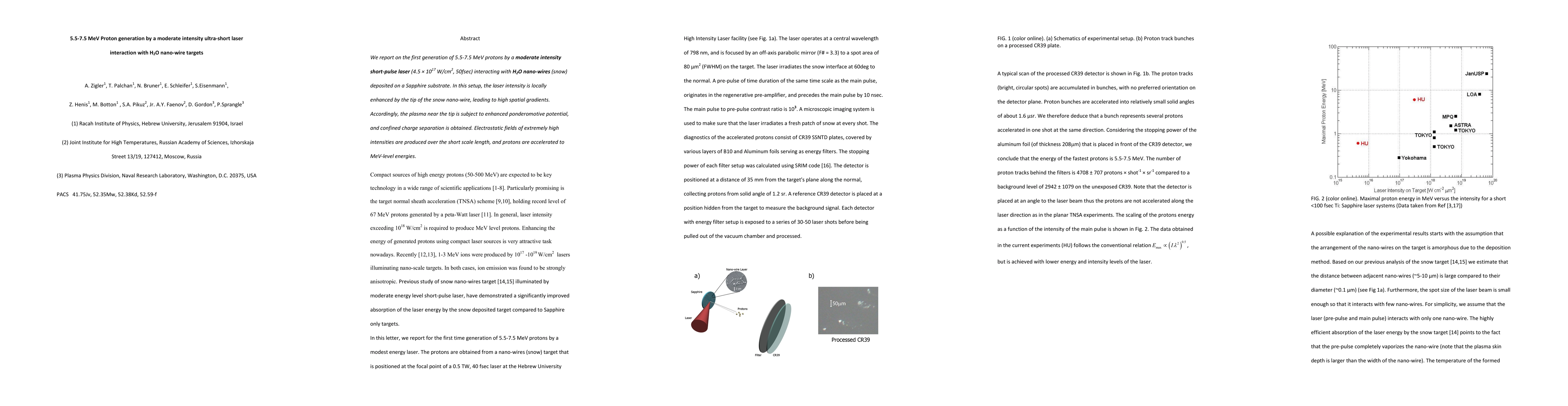 We report on the first generation of 5.5-7.5 MeV protons by a moderate intensity short-pulse laser (4.5 \times 1017 W/cm^2, 50 fsec) interacting with H2O nano-wires (snow) deposited on a Sapphire substrate. In this setup, the laser intensity is locally enhanced by the tip of the snow nano-wire, leading to high spatial gradients. Accordingly, the plasma near the tip is subject to enhanced ponderomotive potential, and confined charge separation is obtained. Electrostatic fields of extremely high intensities are produced over the short scale length, and protons are accelerated to MeV-level energies.
