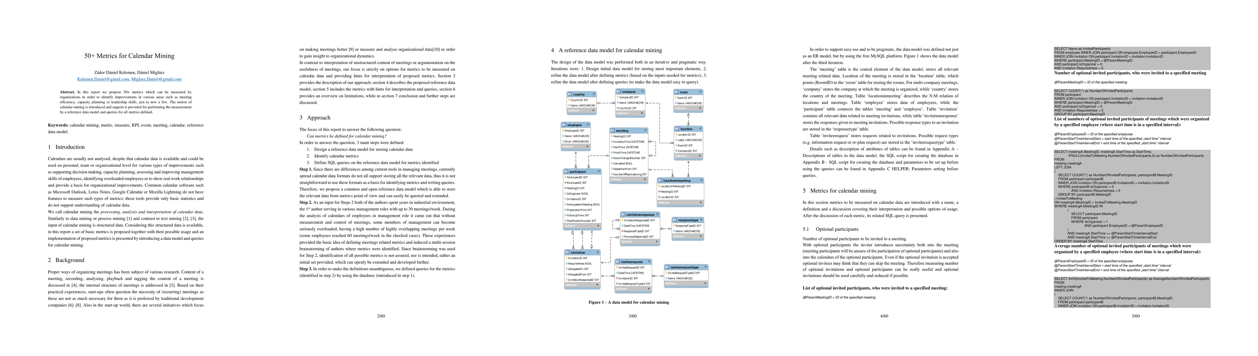 This report introduces over 50 metrics for calendar mining, aimed at enhancing meeting efficiency, capacity planning, and leadership skills. It provides a reference data model and queries to facilitate the measurement of these metrics.