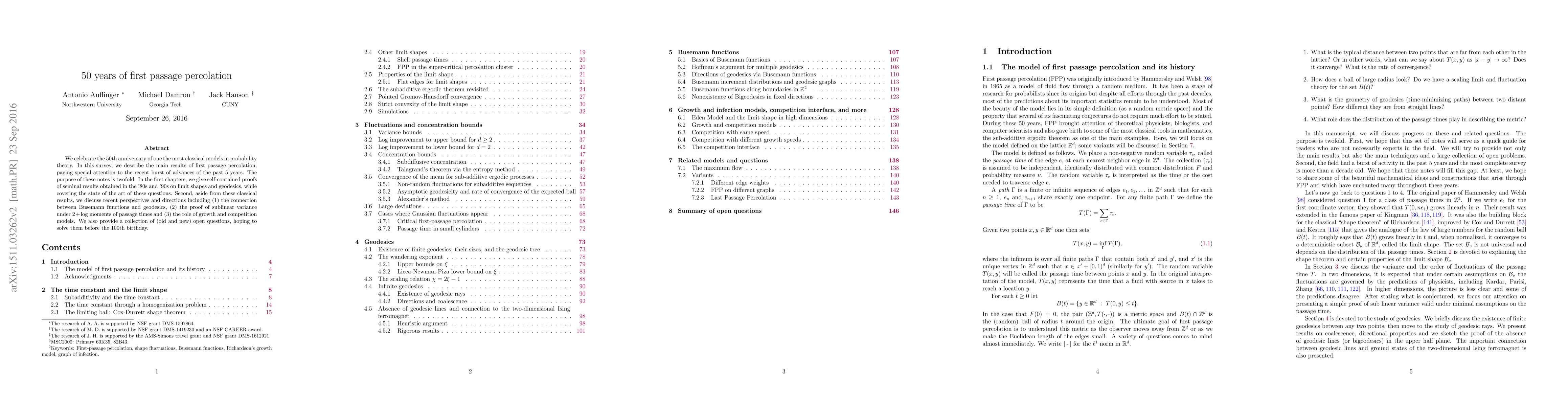 We celebrate the 50th anniversary of one the most classical models in probability theory. In this survey, we describe the main results of first passage percolation, paying special attention to the recent burst of advances of the past 5 years. The purpose of these notes is twofold. In the first chapters, we give self-contained proofs of seminal results obtained in the '80s and '90s on limit shapes and geodesics, while covering the state of the art of these questions. Second, aside from these classical results, we discuss recent perspectives and directions including (1) the connection between Busemann functions and geodesics, (2) the proof of sublinear variance under 2+log moments of passage times and (3) the role of growth and competition models. We also provide a collection of (old and new) open questions, hoping to solve them before the 100th birthday.