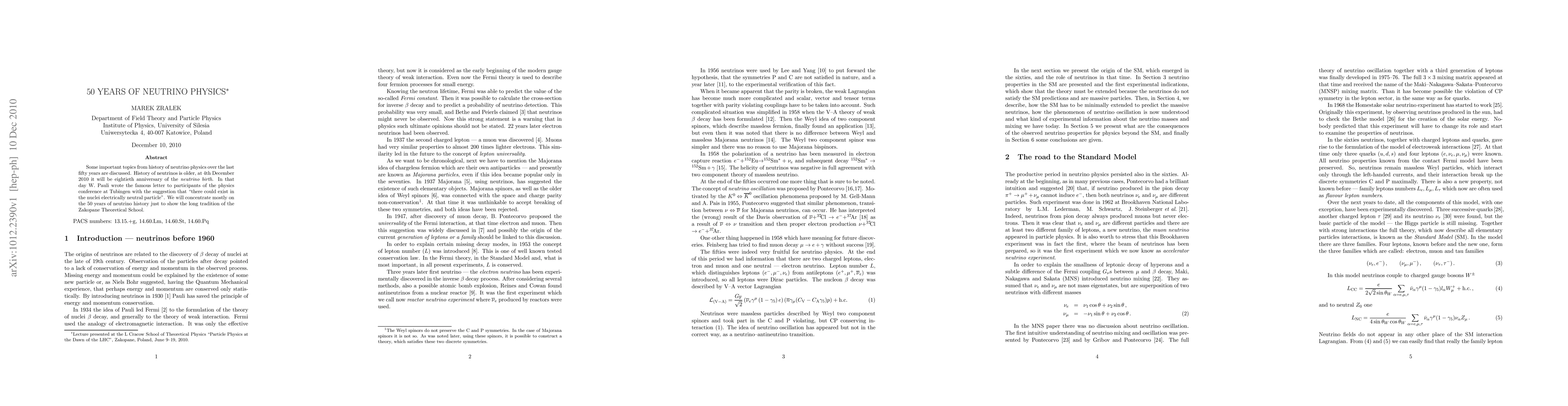 This paper reviews significant milestones in neutrino physics over the past fifty years, highlighting the long-standing tradition of the Zakopane Theoretical School and marking the 80th anniversary of the neutrino's conceptual inception by W. Pauli in 1930.