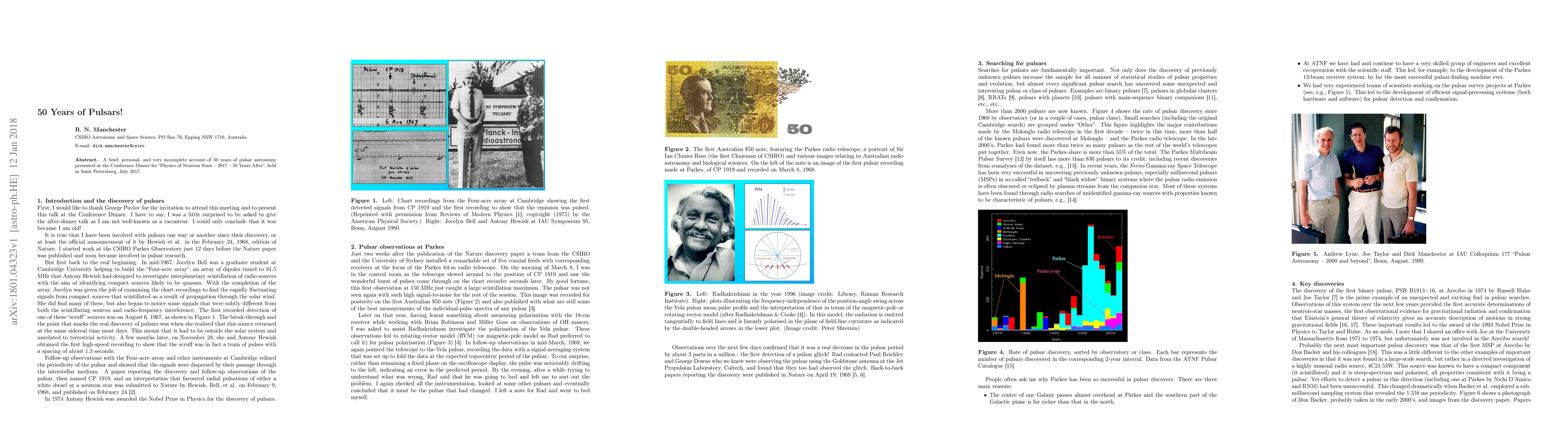 This paper offers a personal, albeit incomplete, retrospective on the 50-year history of pulsar astronomy, presented at a conference celebrating the physics of neutron stars in Saint Petersburg in July 2017. It highlights key discoveries and milestones in the field.