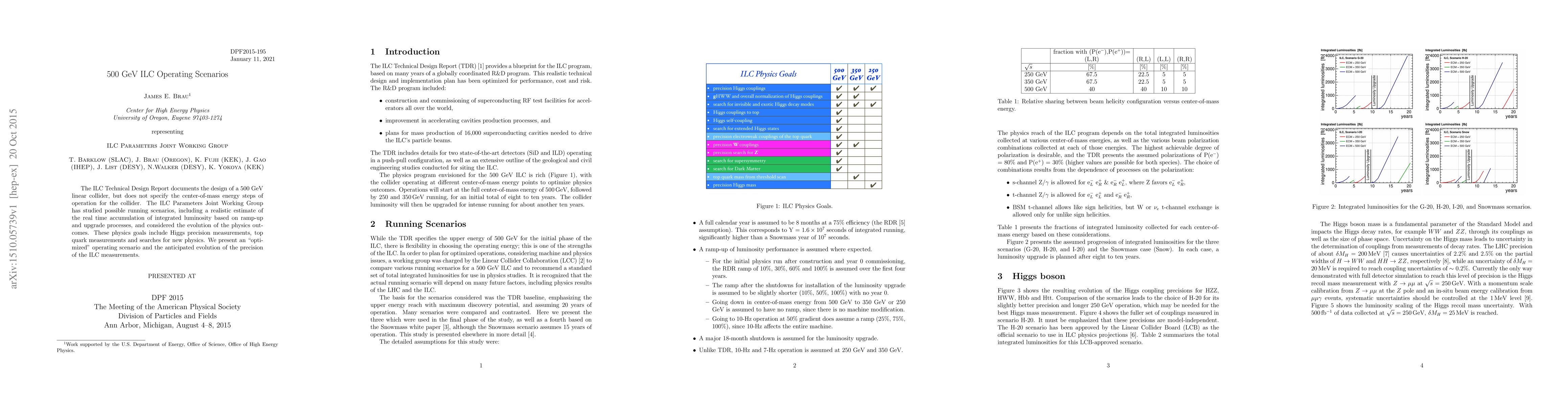 This study explores potential operating scenarios for a 500 GeV International Linear Collider (ILC), focusing on Higgs and top quark measurements, and new physics searches. It presents an 'optimized' scenario with anticipated precision improvements in ILC measurements, based on realistic accumulation of integrated luminosity through ramp-up and upgrade processes.