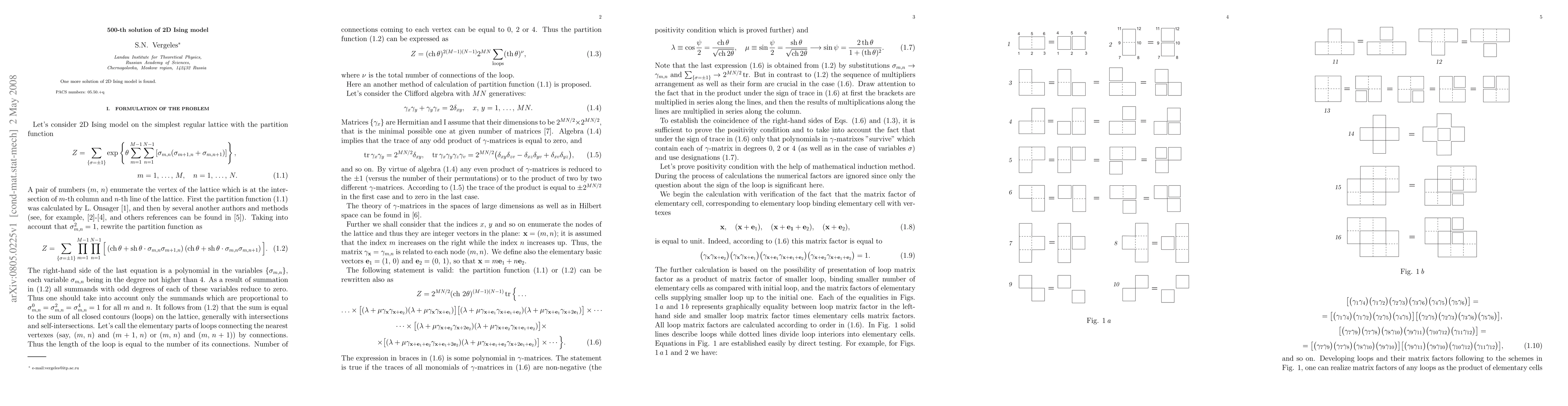 Summary: This paper presents the 500th solution to the 2D Ising model, contributing to the extensive body of research on this fundamental statistical mechanics problem. The discovery adds to our understanding of phase transitions and critical phenomena in two-dimensional systems.