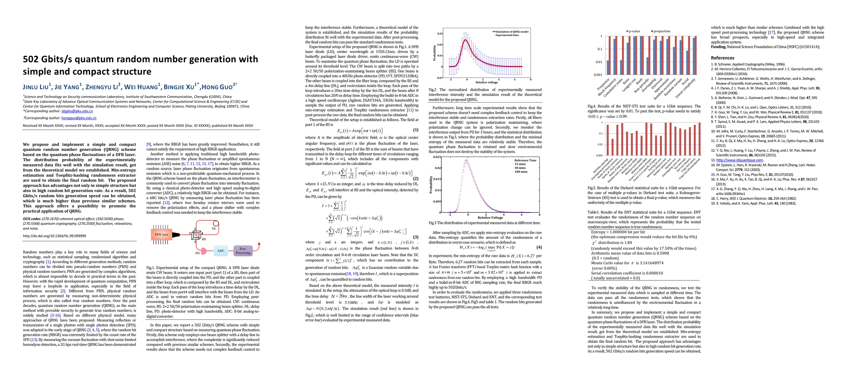 We propose and implement a simple and compact quantum random number generation (QRNG) scheme based on the quantum phase fluctuations of a DFB laser. The distribution probability of the experimentally measured data fits well with the simulation result, got from the theoretical model we established. Min-entropy estimation and Toeplitz-hashing randomness extractor are used to obtain the final random bit. The proposed approach has advantages not only in simple structure but also in high random bit generation rate. As a result, 502 Gbits/s random bits generation speed can be obtained, which is much higher than previous similar schemes. This approach offers a possibility to promote the practical application of QRNG.