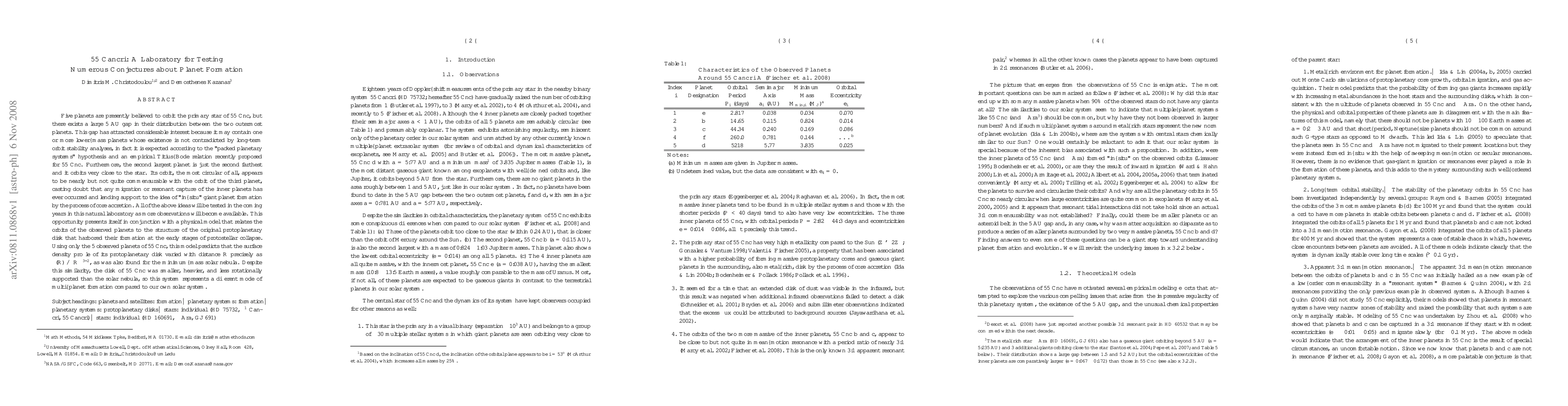 Five planets are presently believed to orbit the primary star of 55 Cnc, but there exists a large 5 AU gap in their distribution between the two outermost planets. This gap has attracted considerable interest because it may contain one or more lower--mass planets whose existence is not contradicted by long-term orbit stability analyses, in fact it is expected according to the "packed planetary systems" hypothesis and an empirical Titius--Bode relation recently proposed for 55 Cnc. Furthermore, the second largest planet is just the second farthest and it orbits very close to the star. Its orbit, the most circular of all, appears to be nearly but not quite commensurable with the orbit of the third planet, casting doubt that any migration or resonant capture of the inner planets has ever occurred and lending support to the idea of "in--situ" giant planet formation by the process of core accretion. All of the above ideas will be tested in the coming years in this natural laboratory as more observations will become available. This opportunity presents itself in conjunction with a physical model that relates the orbits of the observed planets to the structure of the original protoplanetary disk that harbored their formation at the early stages of protostellar collapse. Using only the 5 observed planets of 55 Cnc, this model predicts that the surface density profile of its protoplanetary disk varied with distance $R$ precisely as $\Sigma (R)\propto R^{-3/2}$, as was also found for the minimum--mass solar nebula. Despite this similarity, the disk of 55 Cnc was smaller, heavier, and less rotationally supported than the solar nebula, so this system represents a different mode of multi--planet formation compared to our own solar system.