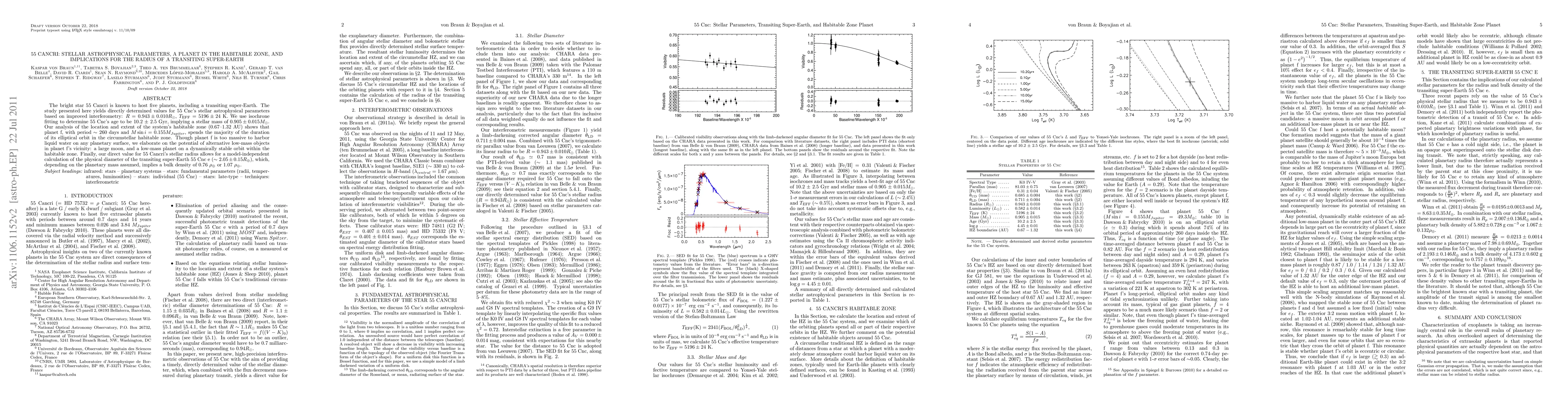 This study refines the astrophysical parameters of the star 55 Cancri, revealing it hosts a planet f in the habitable zone, and determines a precise stellar radius. The analysis suggests the possibility of a large moon or a low-mass planet in the habitable zone, alongside a model-independent diameter for the transiting super-Earth 55 Cnc e.